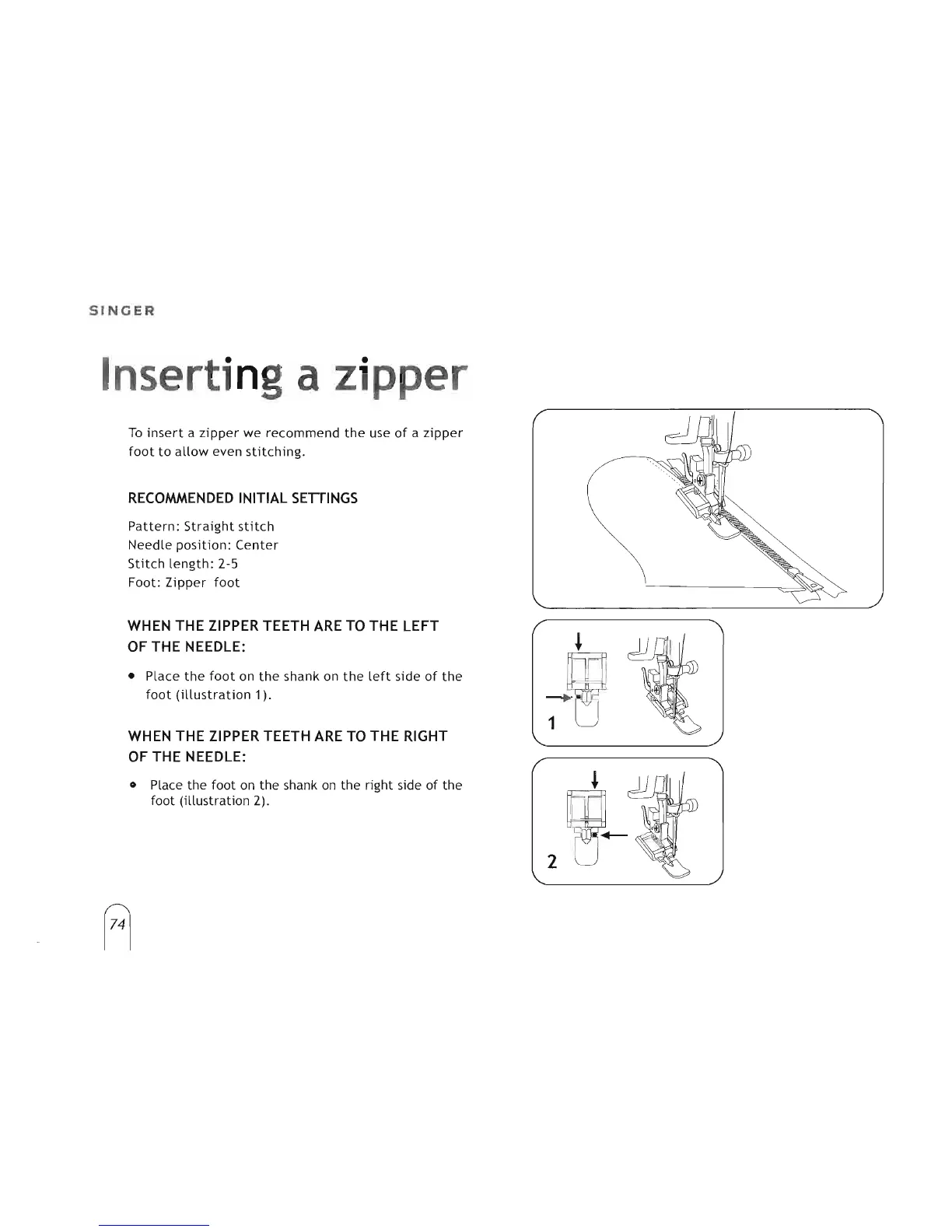 Singer 5160 - Inserting a Zipper; When the Zipper Teeth Are to the Left of the Needle; When the Zipper Teeth Are to the Right of the Needle
