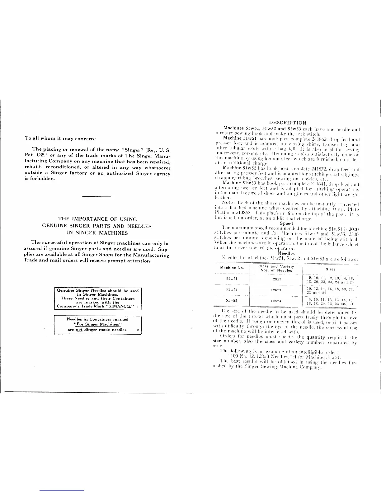 Singer 51W51 - MACHINE SPECIFICATIONS AND NEEDLE SELECTION; Machine Models Overview and Speed; Needle and Thread Compatibility Chart; IMPORTANCE OF GENUINE SINGER PARTS