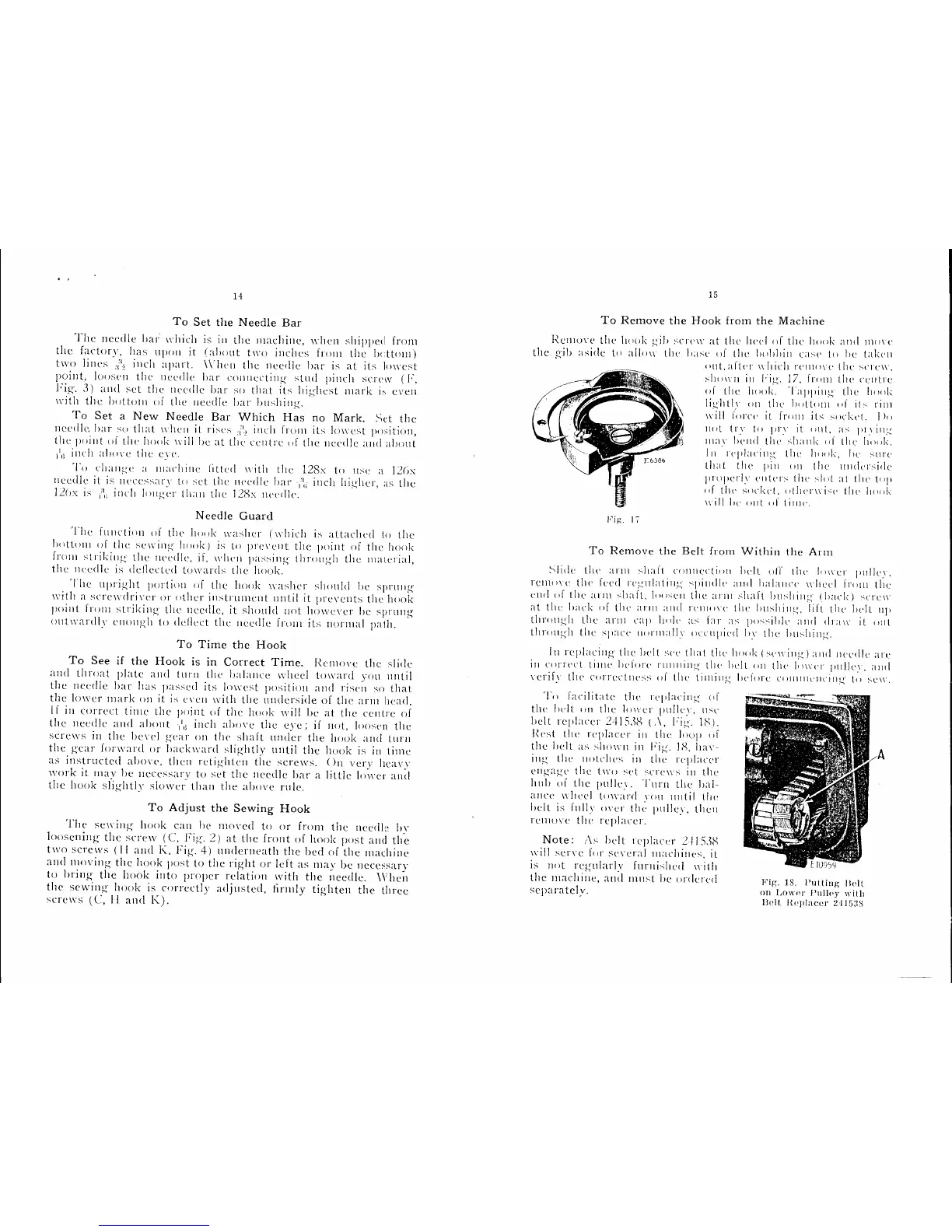 Singer 51W51 - NEEDLE BAR AND HOOK SETTINGS; Setting the Needle Bar Correctly; Needle Guard and Hook Timing; MACHINE MAINTENANCE AND BELT REPLACEMENT