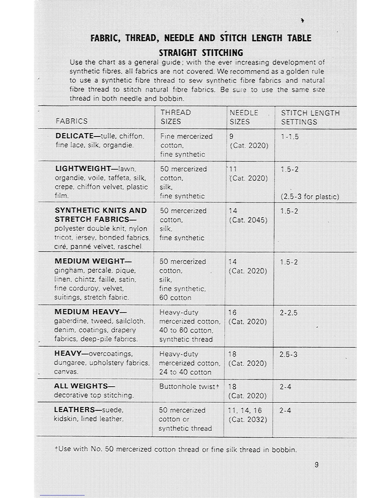 Singer 522 - Fabric, Thread, Needle and Stitch Length Table Straight Stitching