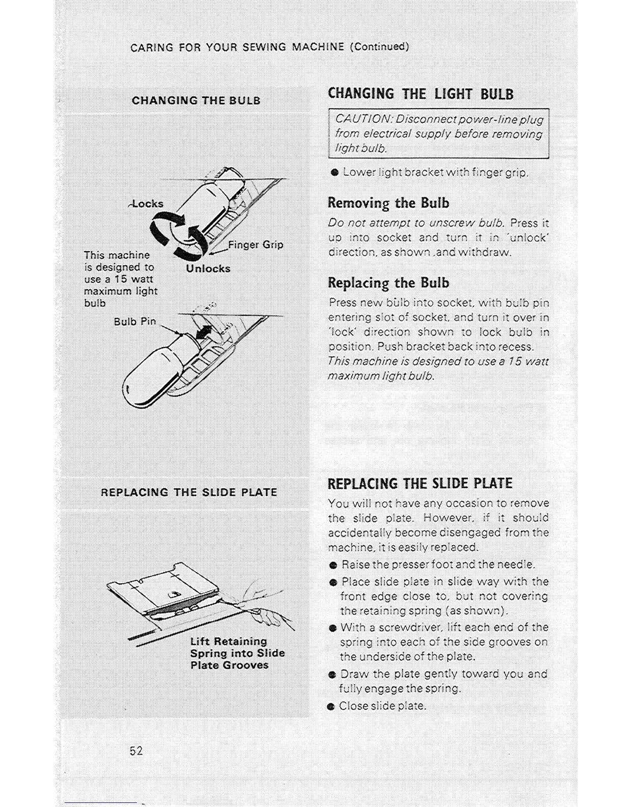 Singer 522 - Changing the Light Bulb; Replacing the Slide Plate