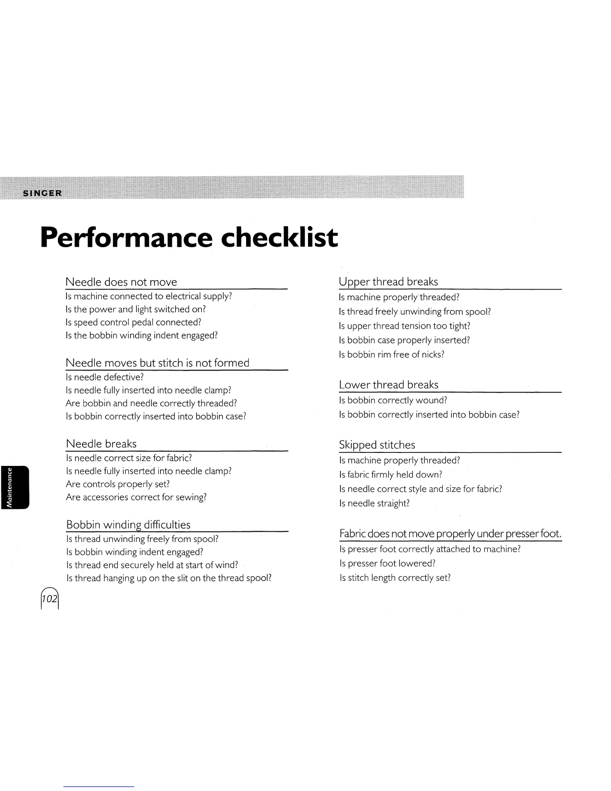 Singer 5417C - Performance checklist; Needle does not move; Needle moves but stitch is not formed; Needle breaks