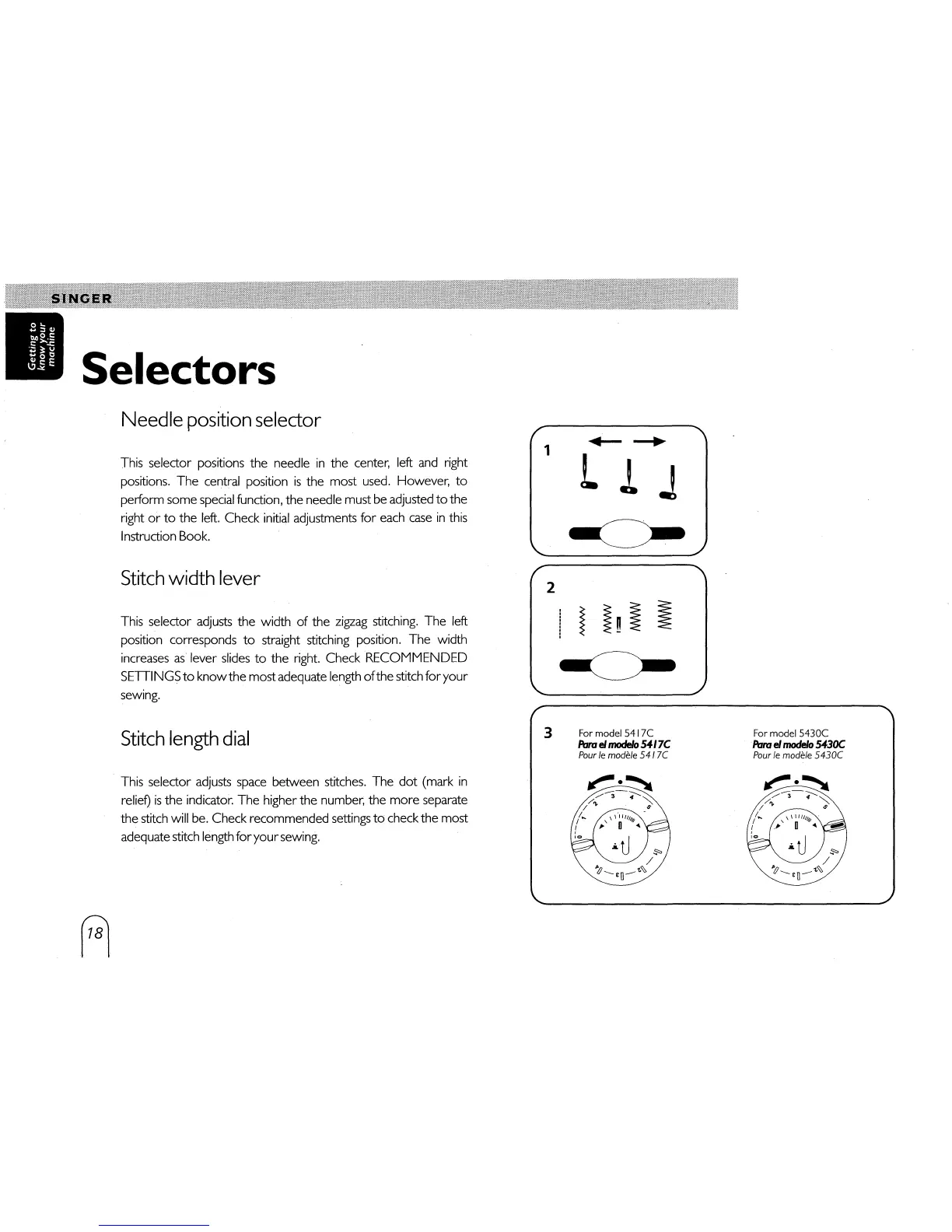 Singer 5417C - Selectors; Needle position selector; Stitch width lever; Stitch length dial