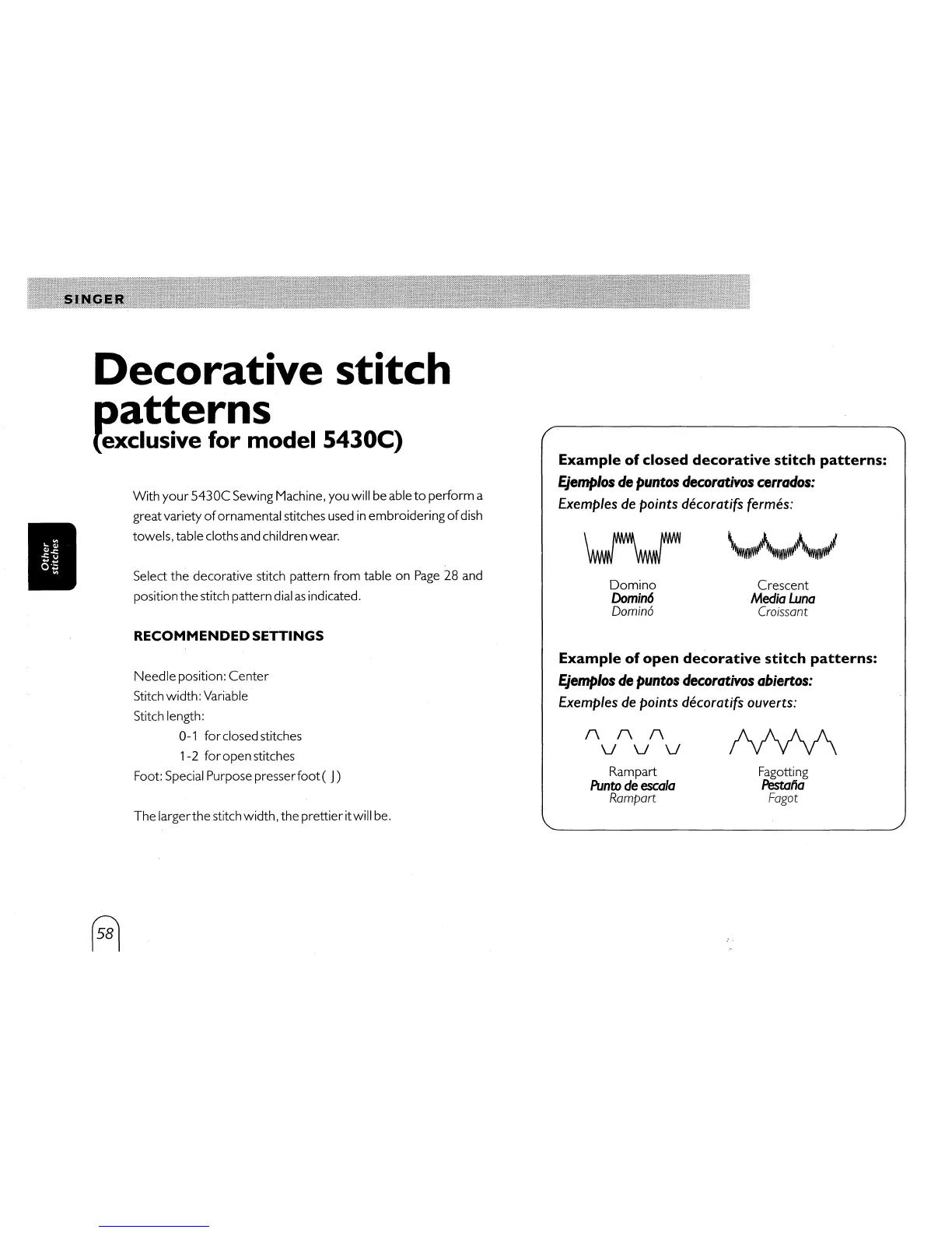 Singer 5430C - Decorative stitch patterns (exclusive for model 5430 C); Recommended Settings