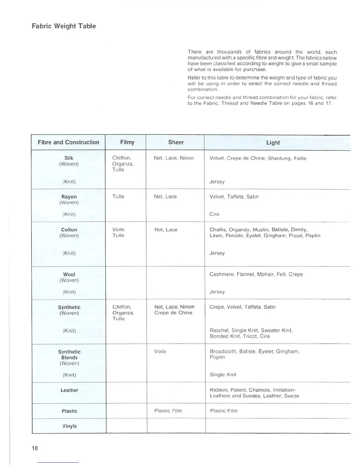 Singer 5505; 5525 - Fabric Weight Table