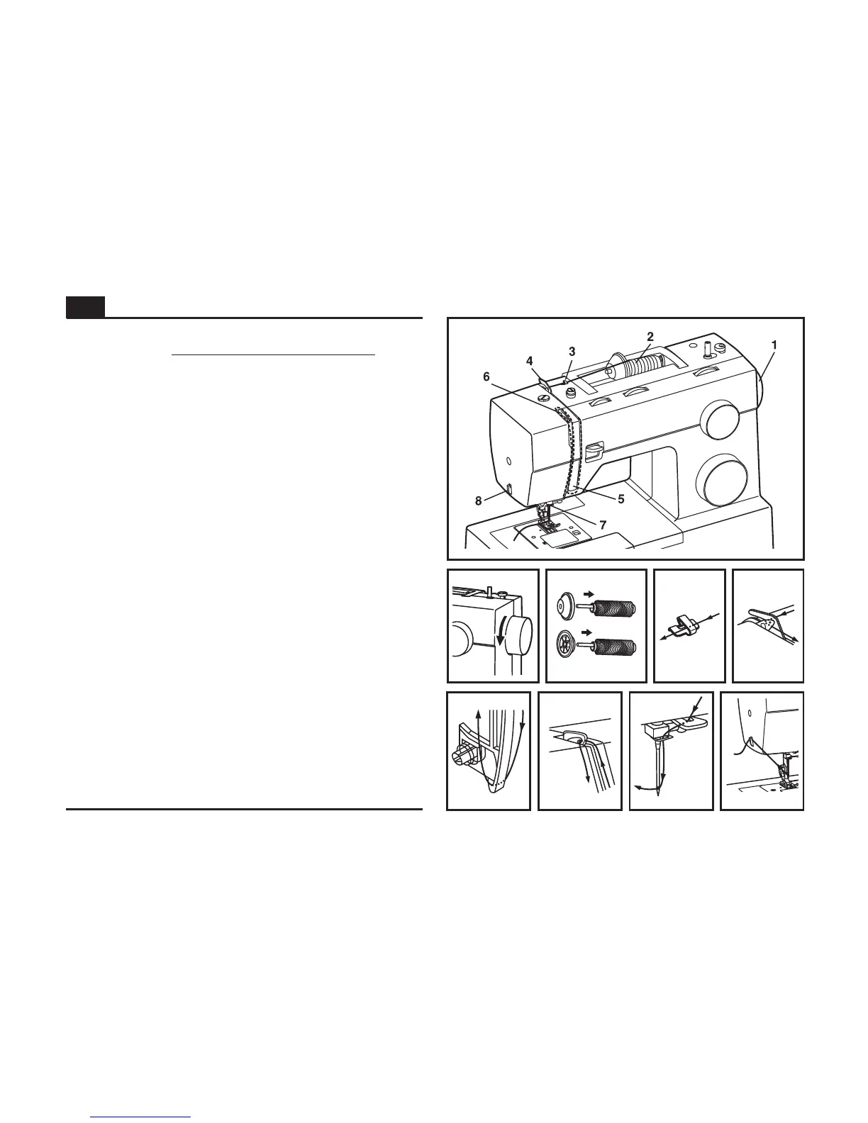 - Pull about 6-8 inches of thread to the rear beyond the needle