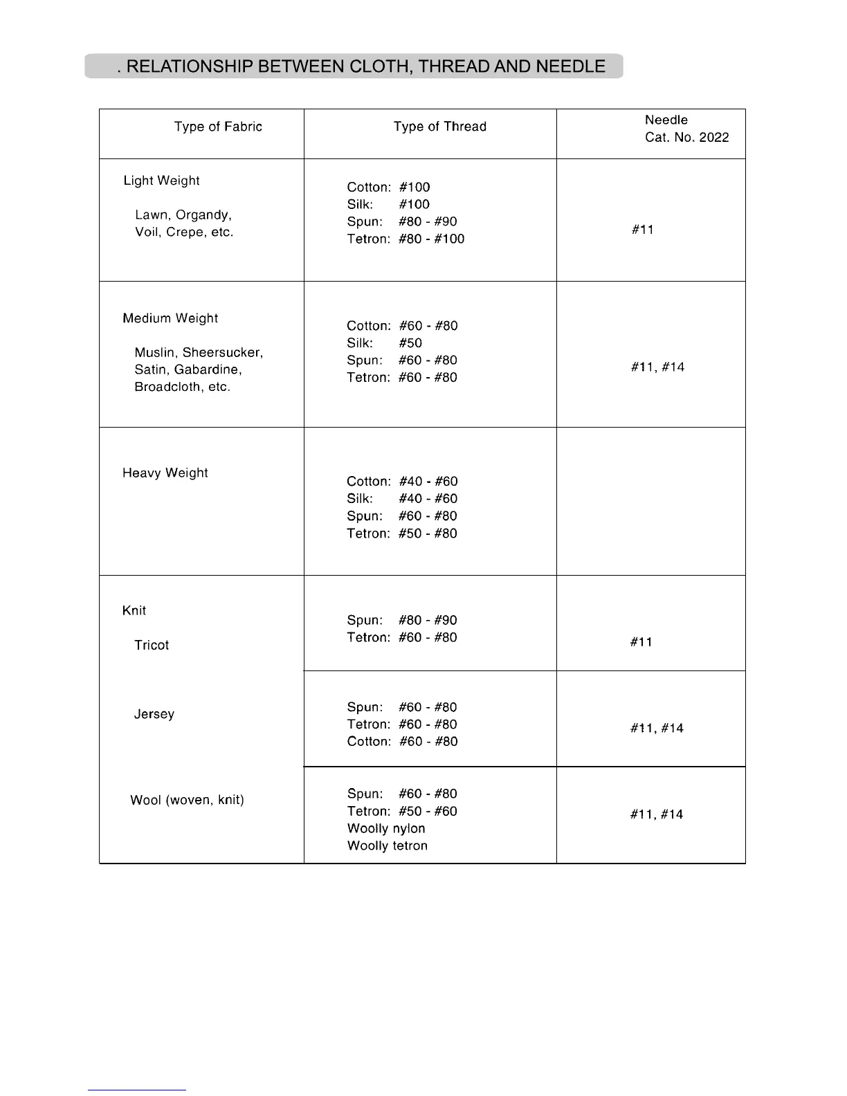 SINGER needle, Cat. No. 2022 is furnished with the machine. However, it is recommended that you select