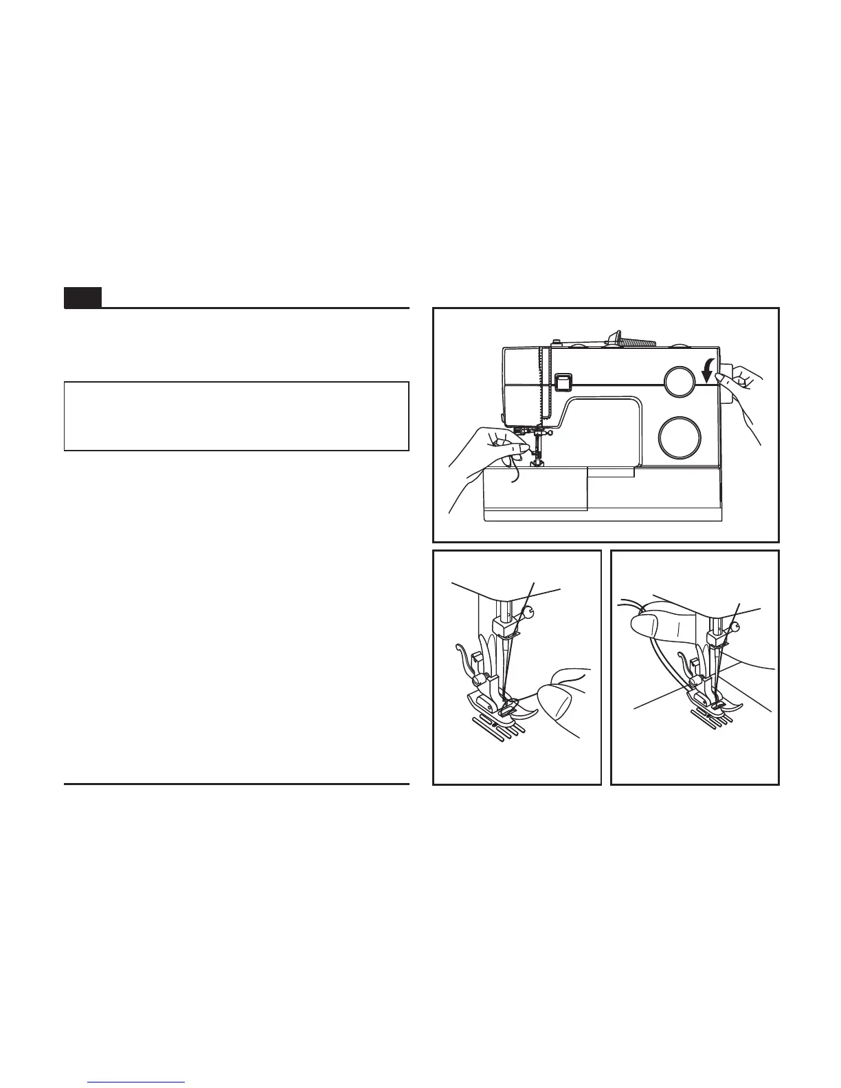Hold the upper thread with the left hand. Turn the handwheel