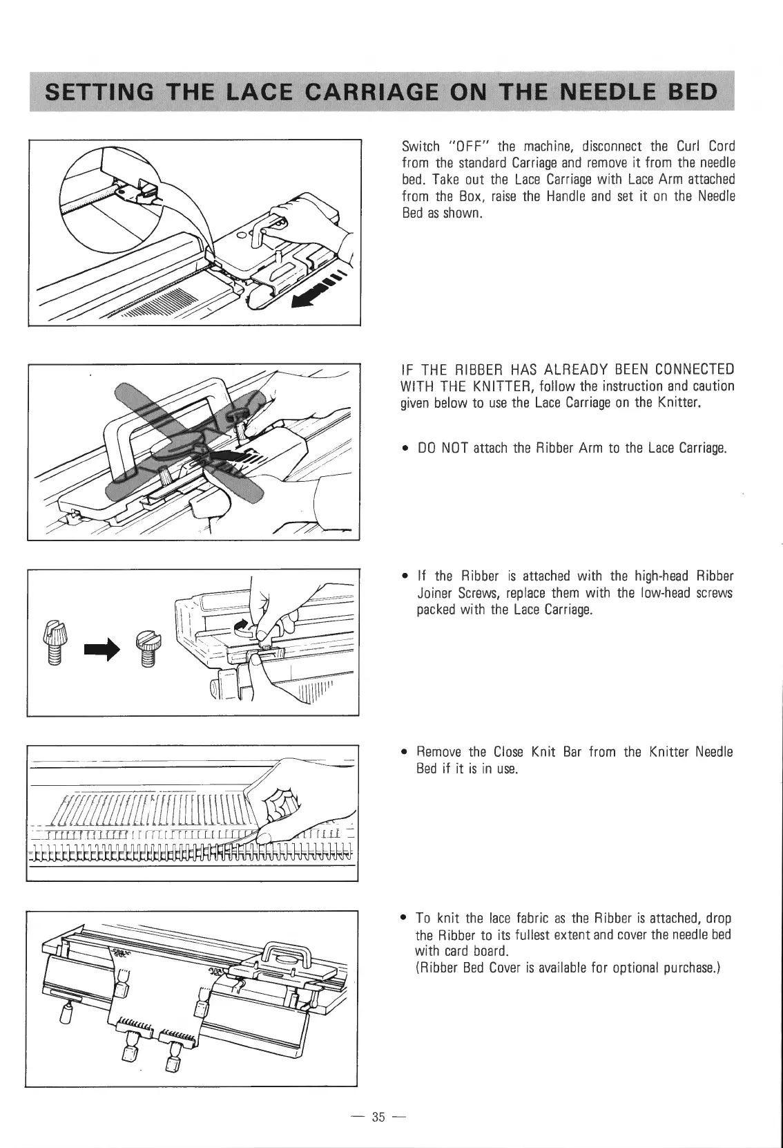 Singer 560 - Setting the Lace Carriage on the Needle Bed; IF THE RIBBER HAS ALREADY BEEN CONNECTED WITH THE KNITTER