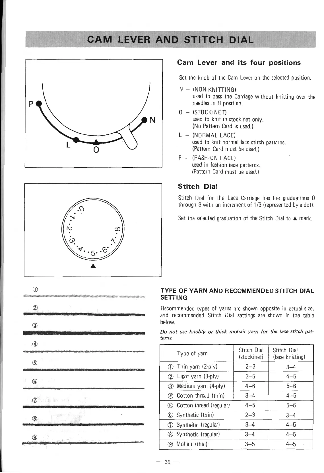 Singer 560 - Lace Carriage Cam Lever and Stitch Dial; Cam Lever and its four positions; Stitch Dial; TYPE OF YARN AND RECOMMENDED STITCH DIAL SETTING