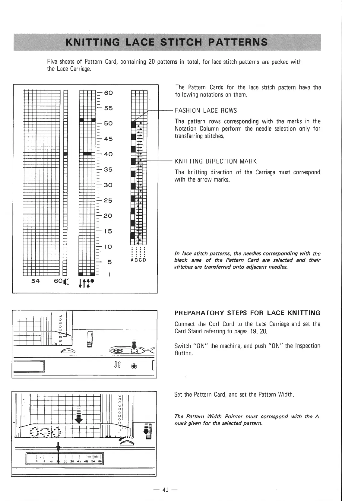 Singer 560 - Knitting Lace Stitch Patterns; PREPARATORY STEPS FOR LACE KNITTING