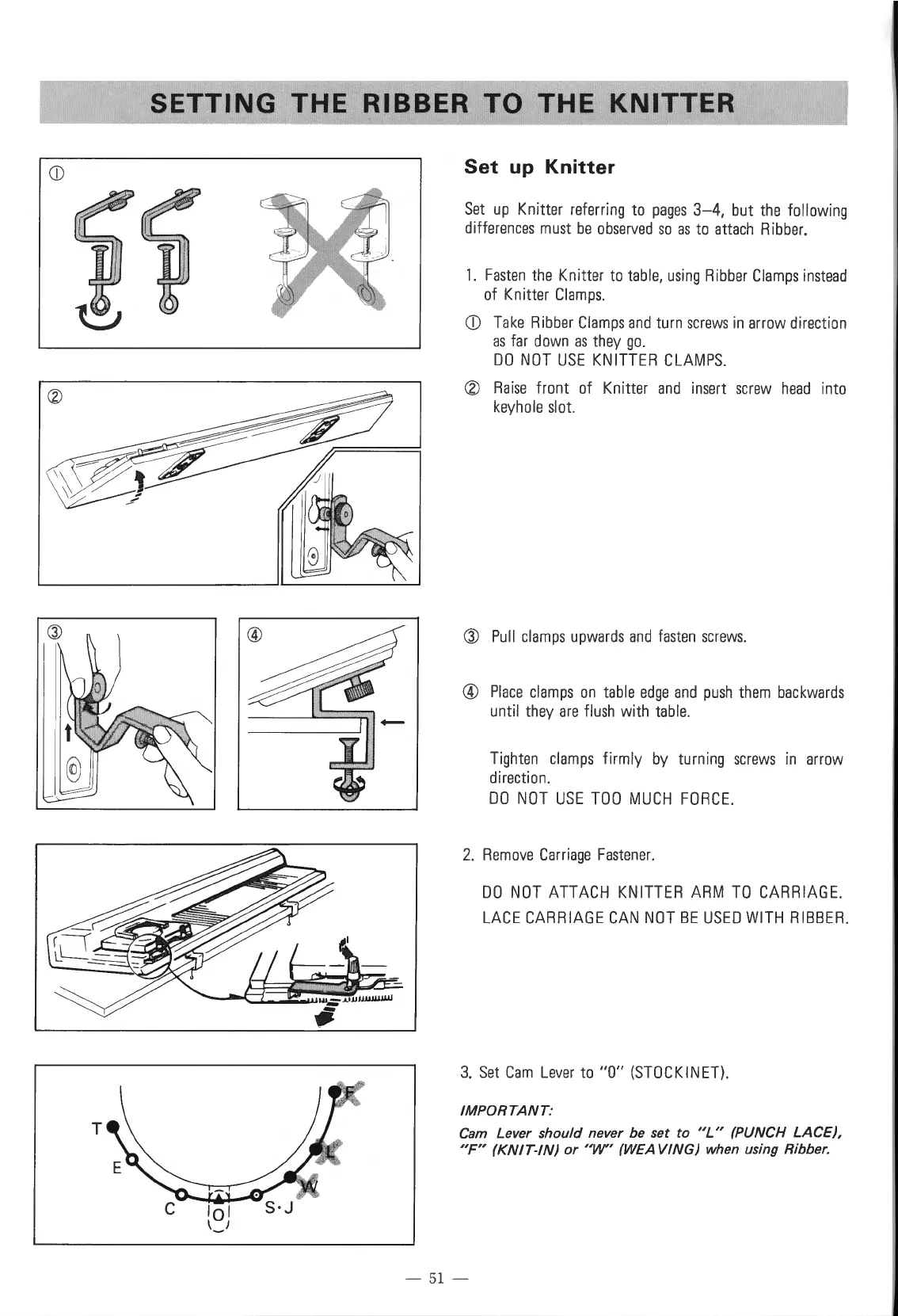 Singer 560 - Ribber Setup and Operations; Set up Knitter; Remove Carriage Fastener; Set Cam Lever