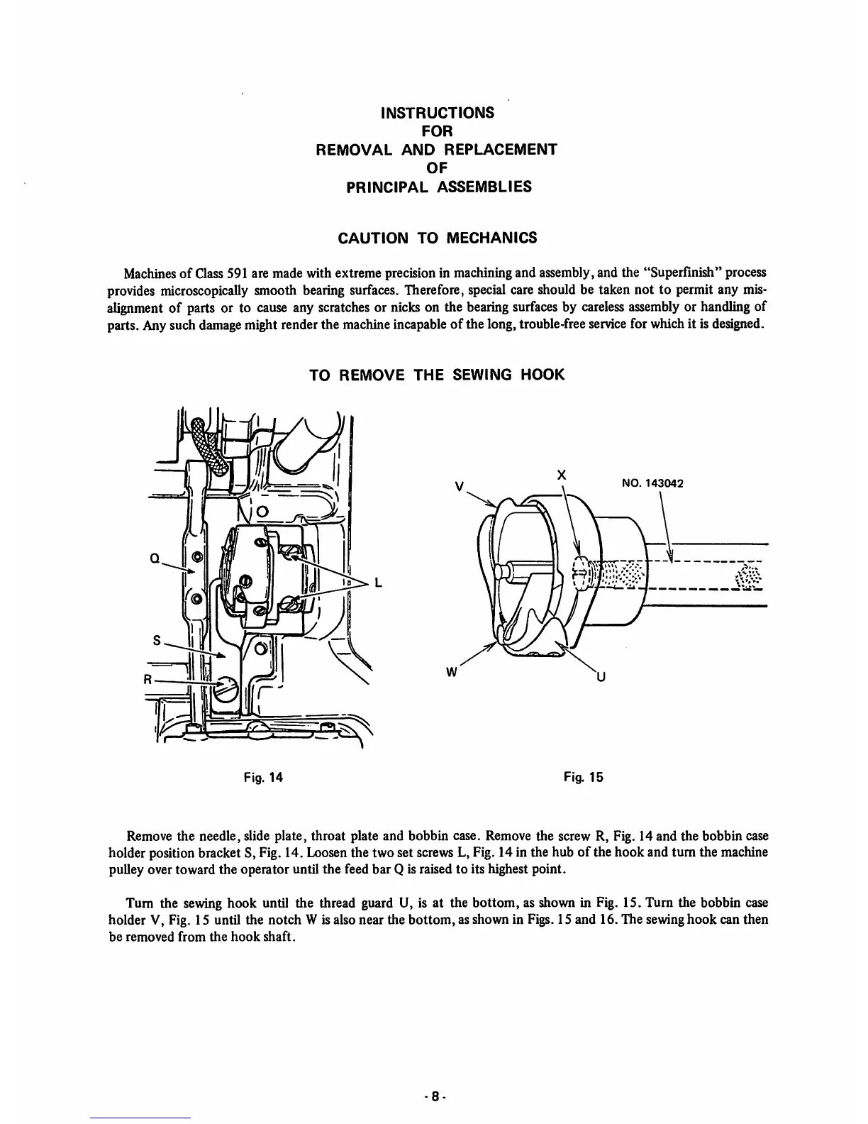 Remove the needle, slide plate, throat plate and bobbin case. Remove the screw R, Fig. 14 and the bobbin case