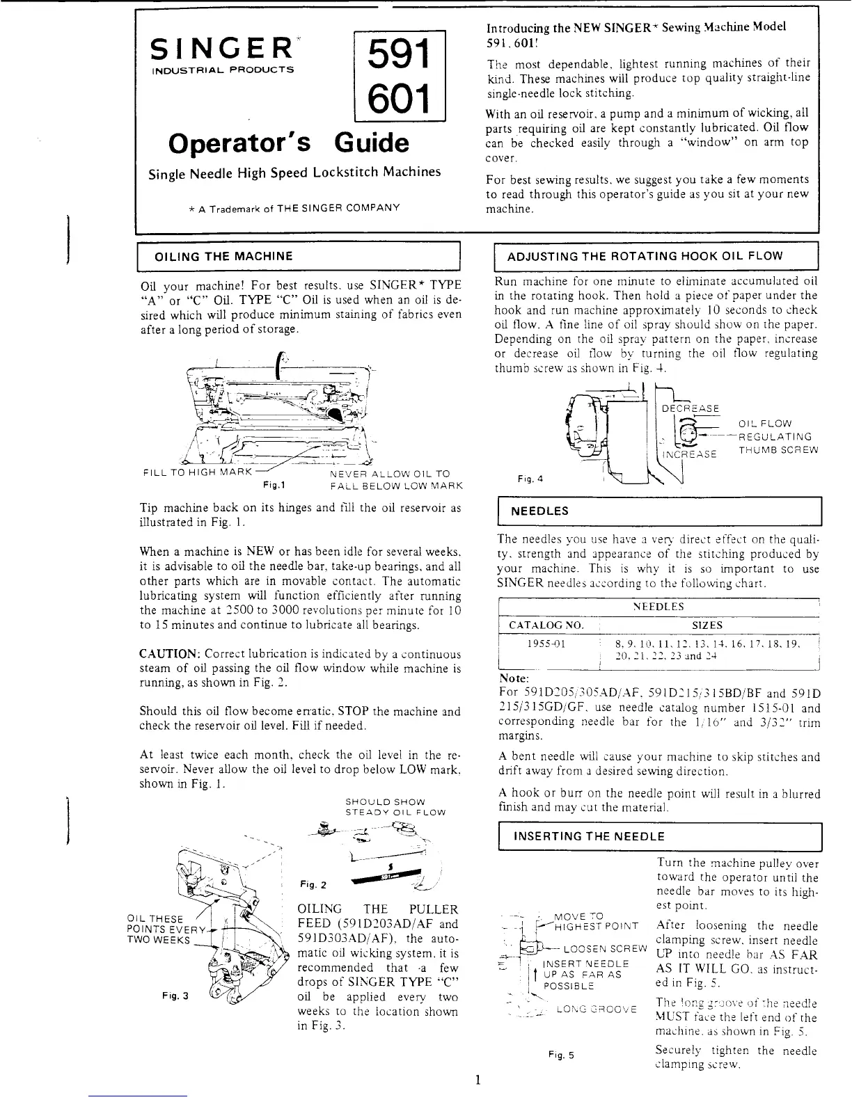 Singer 601 - Operators Guide for SINGER 591;601 Machines; Introduction to SINGER 591;601 Machines; Machine Oiling Procedures; Adjusting Rotating Hook Oil Flow