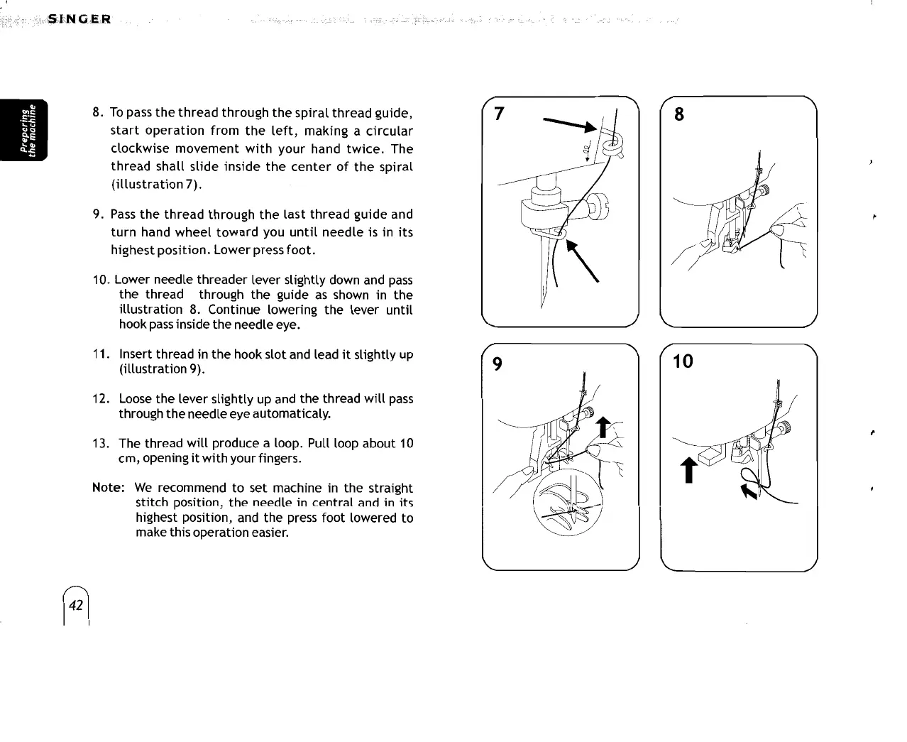 10. Lower needle threader lever slightly down and
