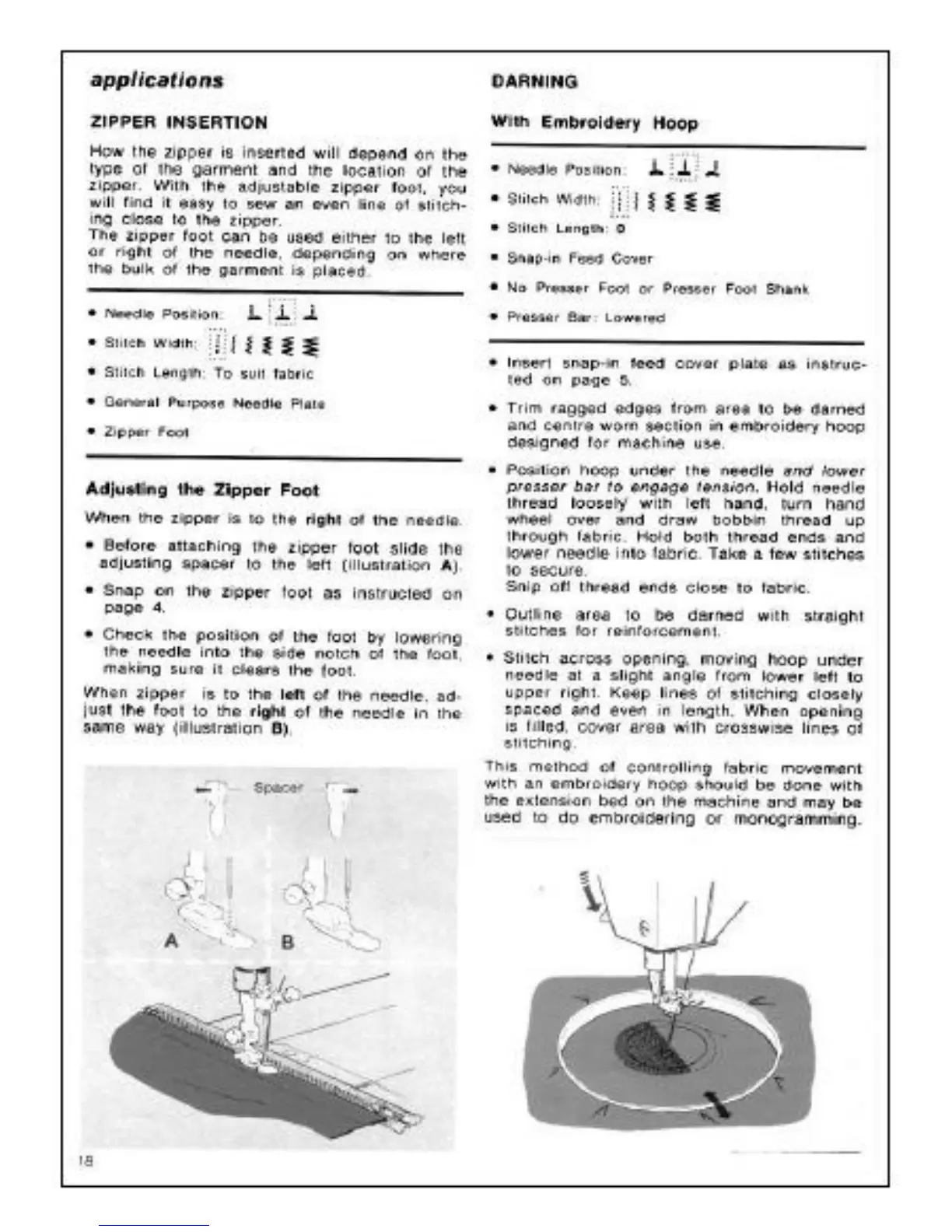 Singer 6105 - Applications; Zipper Insertion; Adjusting the Zipper Foot; Darning
