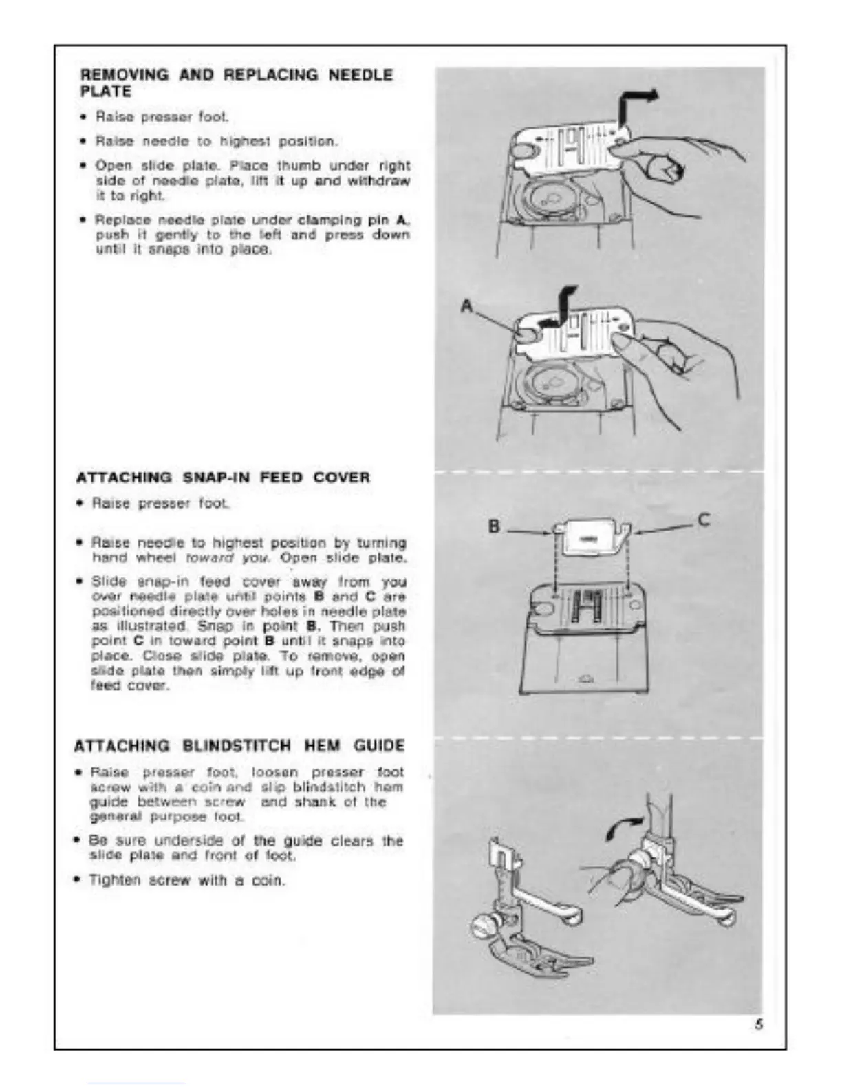 Singer 6105 - Removing and Replacing the Button Foot; Attaching Snap-In Feed Cover; Attaching Blindstitch Hem Guide