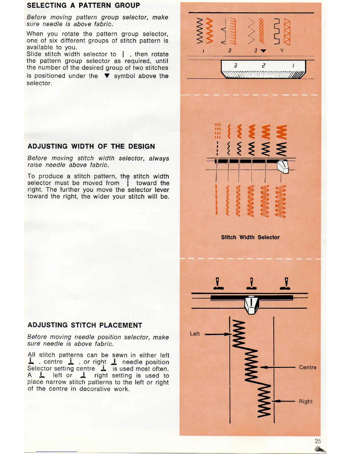 Singer 6136 - SELECTING A PATTERN GROUP; ADJUSTING WIDTH OF THE DESIGN; ADJUSTING STITCH PLACEMENT