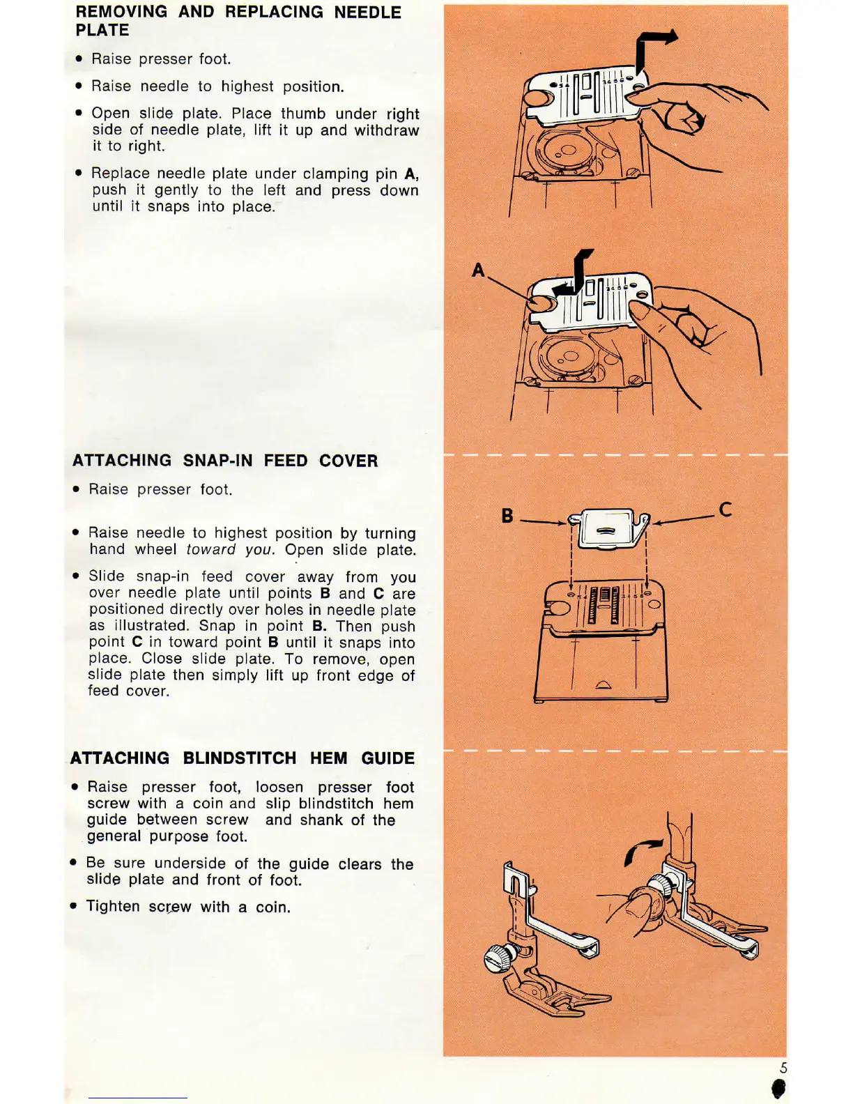 Singer 6136 - REMOVING AND REPLACING NEEDLE PLATE; ATTACHING SNAP-IN FEED COVER; ATTACHING BLINDSTITCH HEM GUIDE