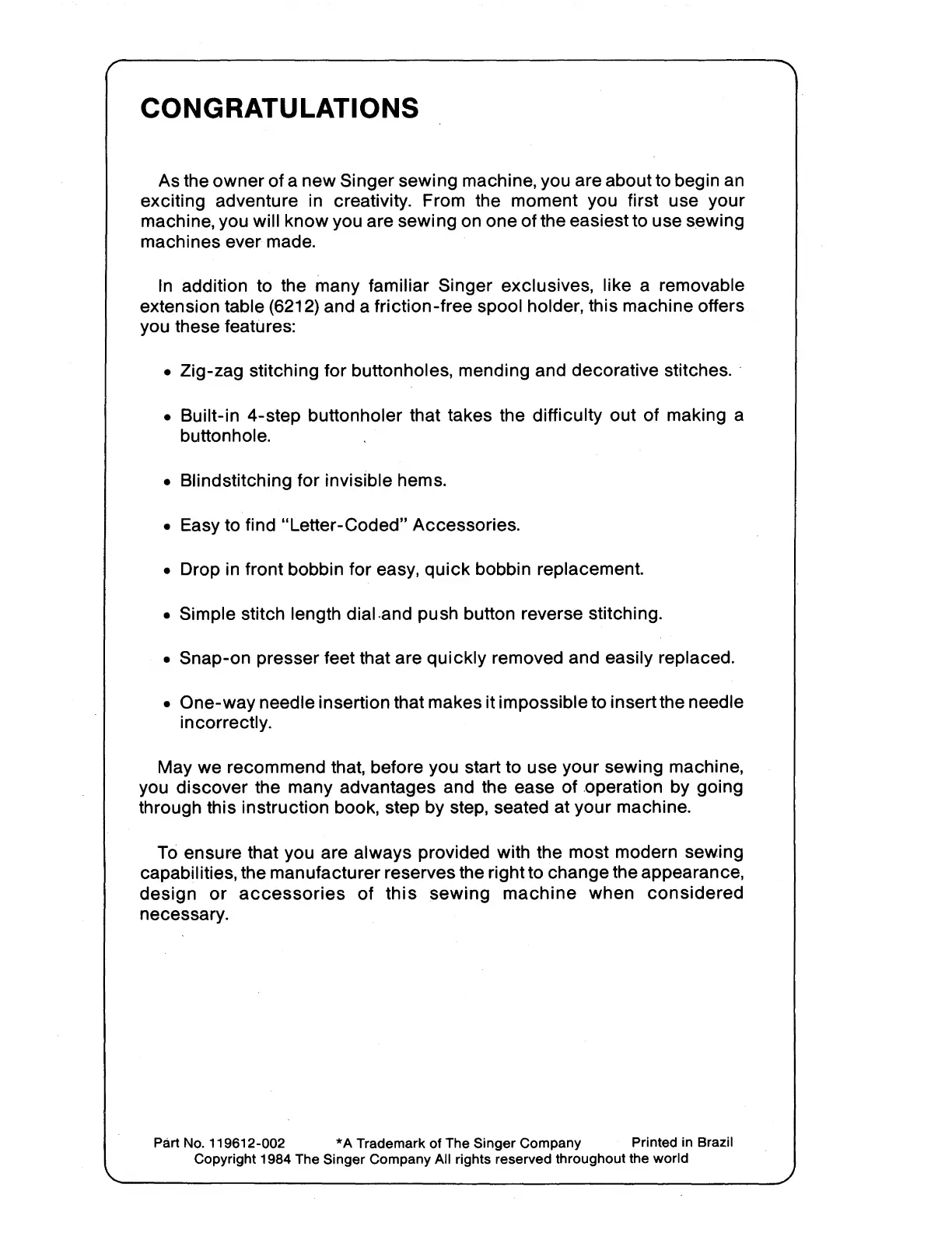 Singer 6202 - Congratulations on Your Singer Sewing Machine