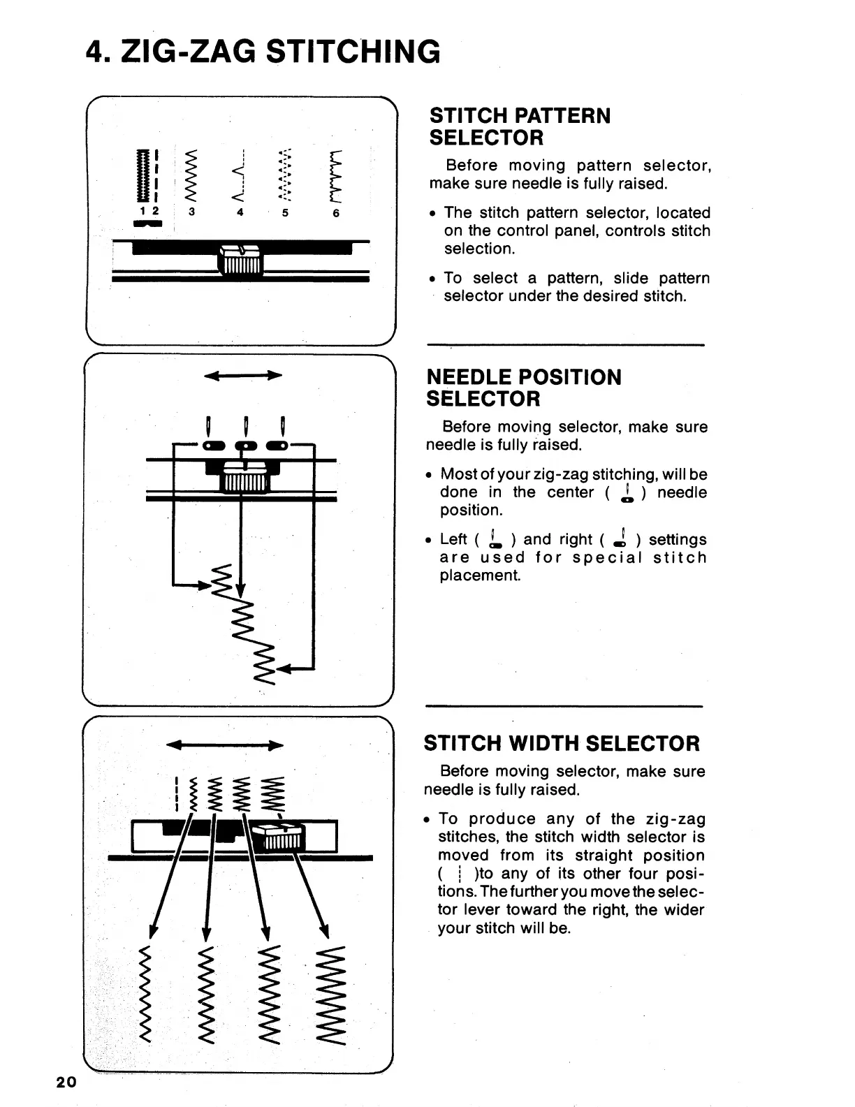 Singer 6202 - Zig-Zag Stitching; Using the Stitch Pattern Selector; Using the Zig-Zag Needle Position Selector; Using the Zig-Zag Stitch Width Selector