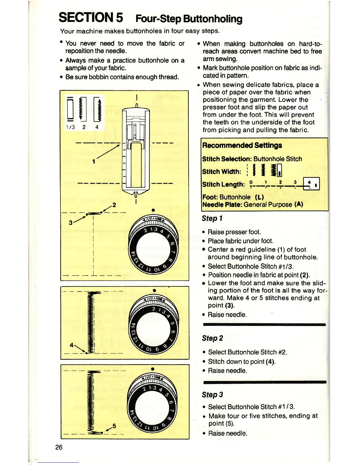 Singer 6233 - Four-Step Buttonholing; Buttonhole Steps and Settings