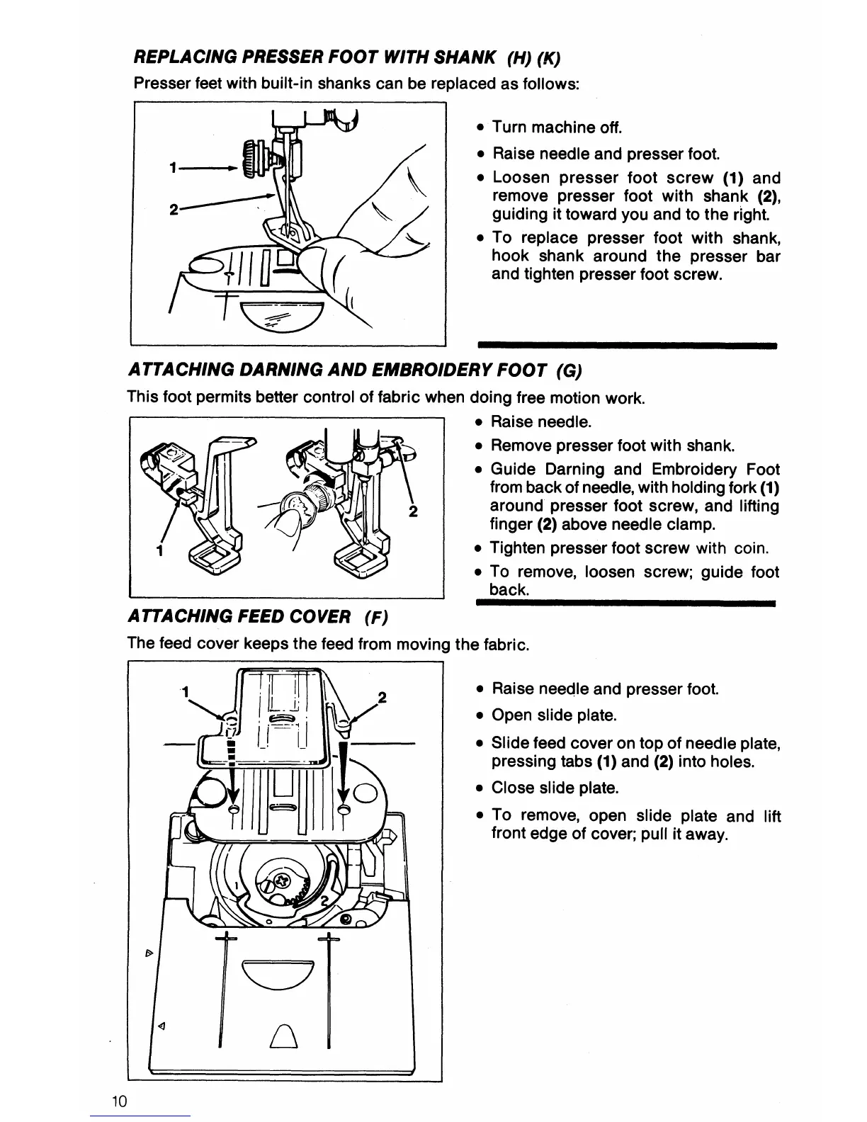 Singer 6234 - Replacing Presser Foot with Shank (H) (K); Attaching Darning and Embroidery Foot (G); Attaching Feed Cover (F)