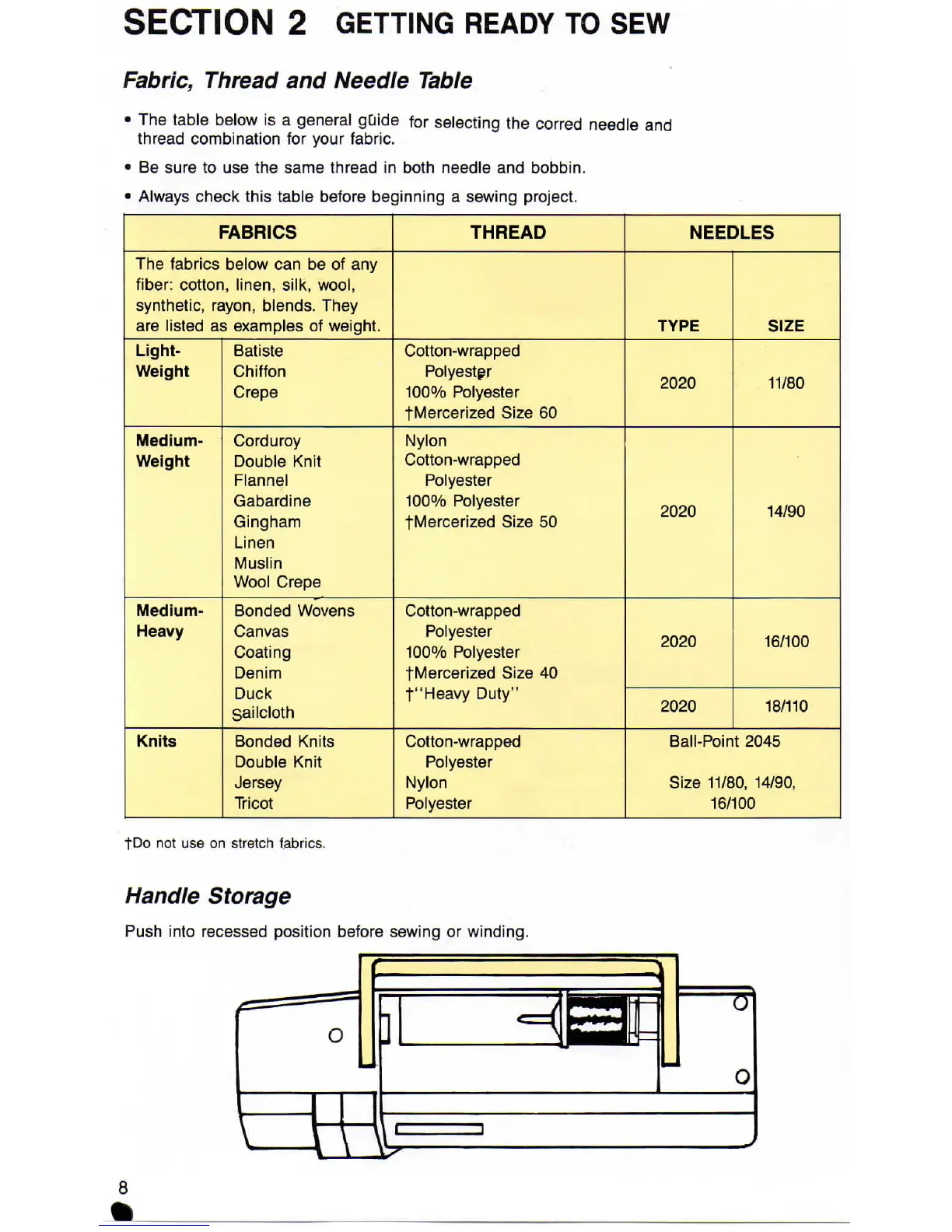 Singer 6235 - Section 2 Getting Ready to Sew; Fabric, Thread and Needle Table; Handle Storage