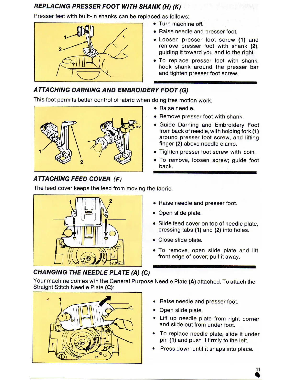 Singer 6235 - Replacing Presser Foot With Shank; Attaching Darning and Embroidery Foot; Attaching Feed Cover; Changing the Needle Plate