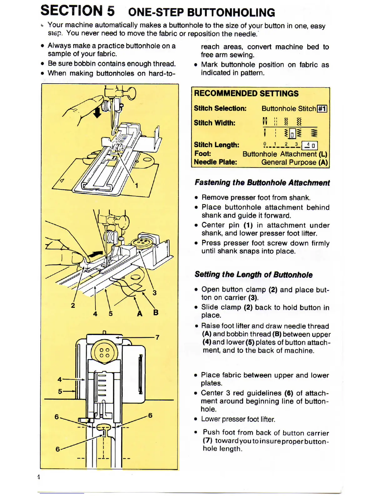Singer 6235 - Section 5 One-Step Buttonholing; Fastening the Buttonhole Attachment; Setting the Length of Buttonhole