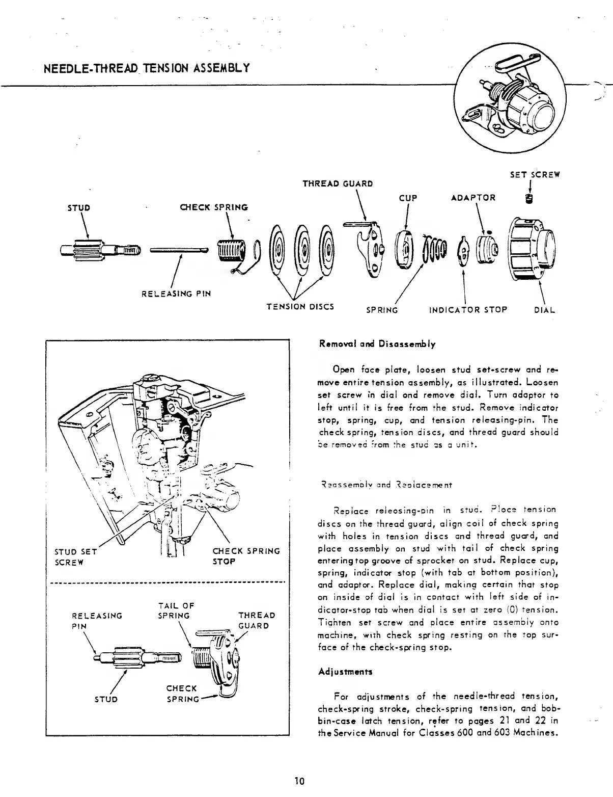 Singer 625 - Needle-Thread Tension Assembly; Removal and Disassembly; Reassembly and Replacement; Adjustments