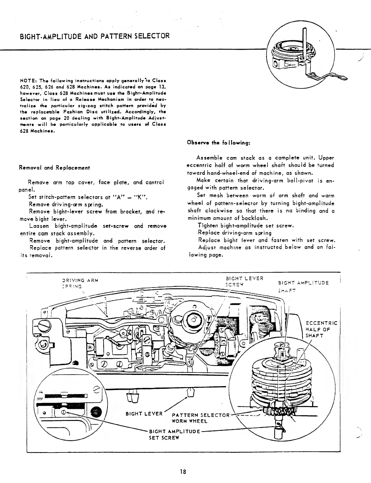 Singer 625 - Bight-Amplitude and Pattern Selector; Removal and Replacement; Adjustments
