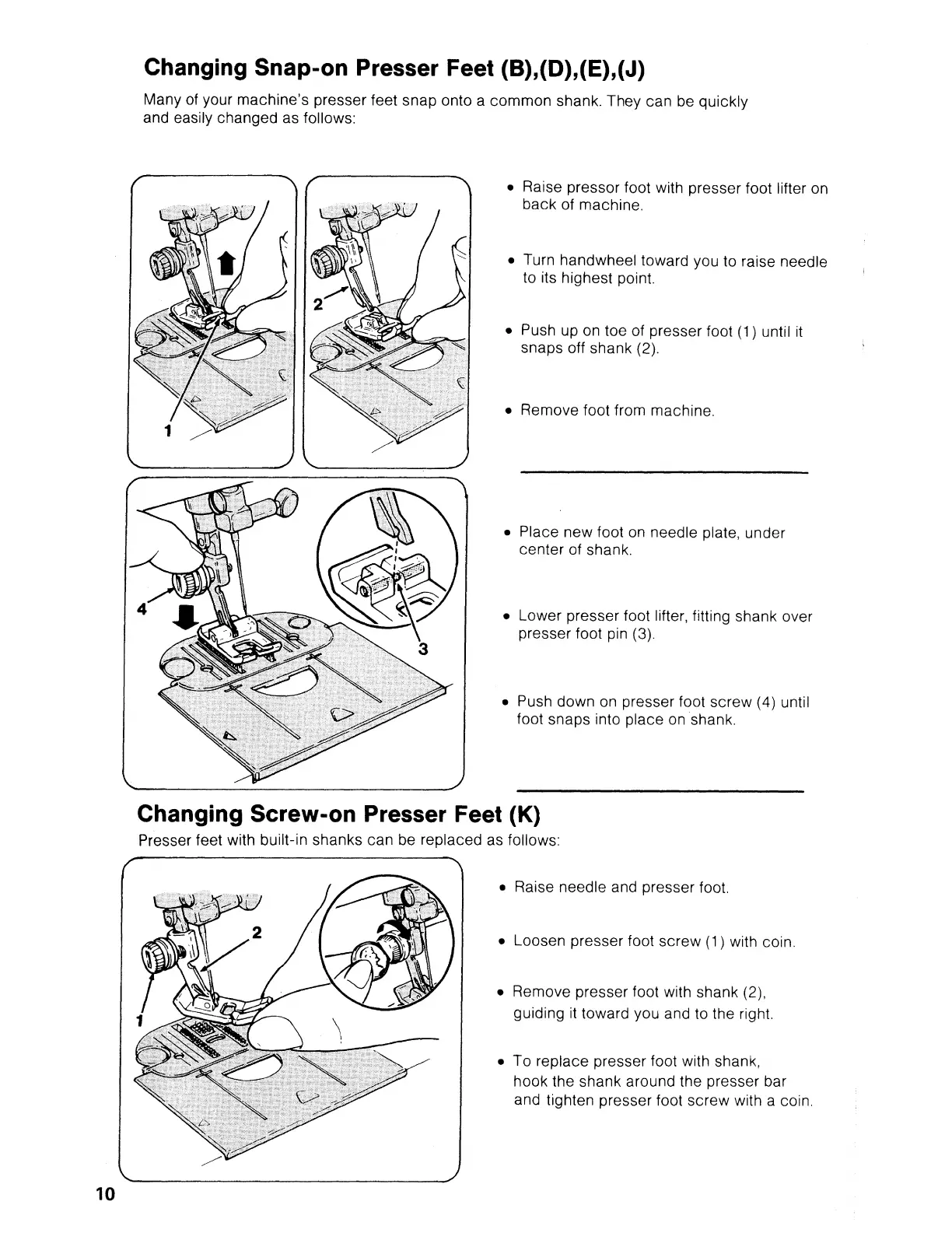 Singer 6267 - Changing Snap-On Presser Feet (B), (D), (E), (J); Changing Screw-On Presser Feet (K)
