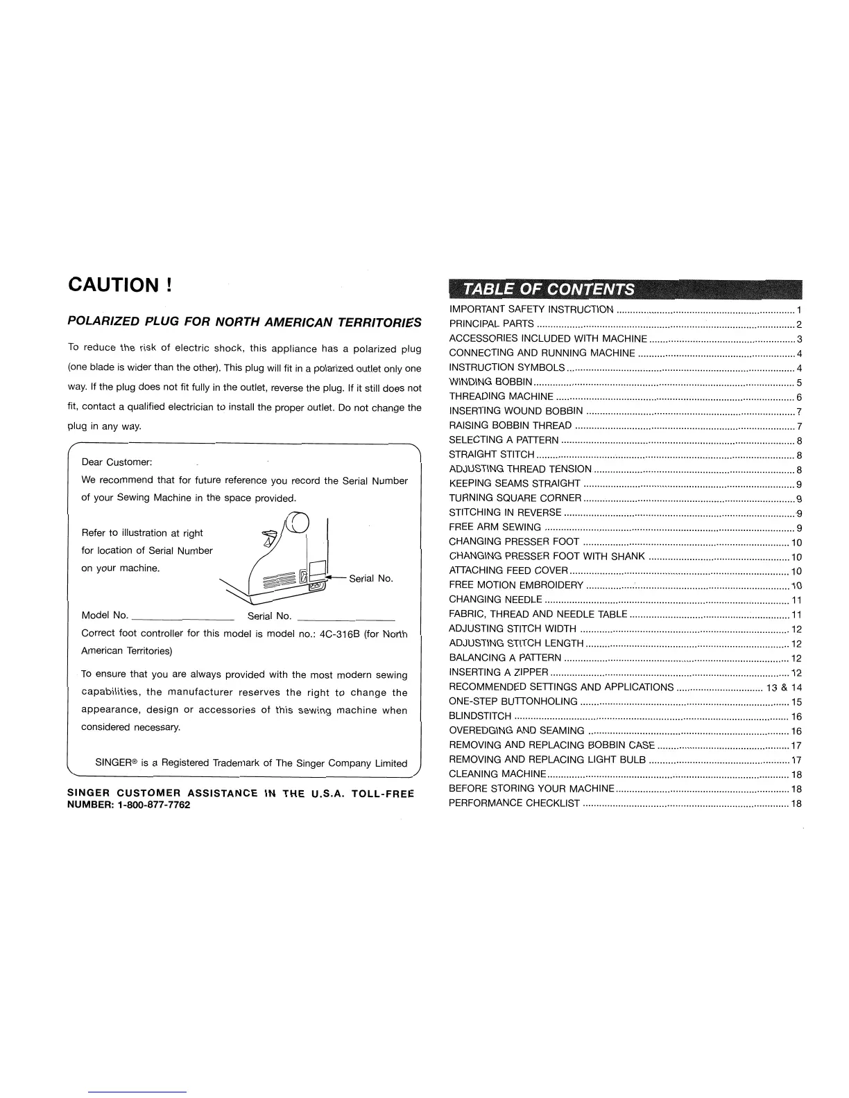 Singer 6408 - Table of Contents