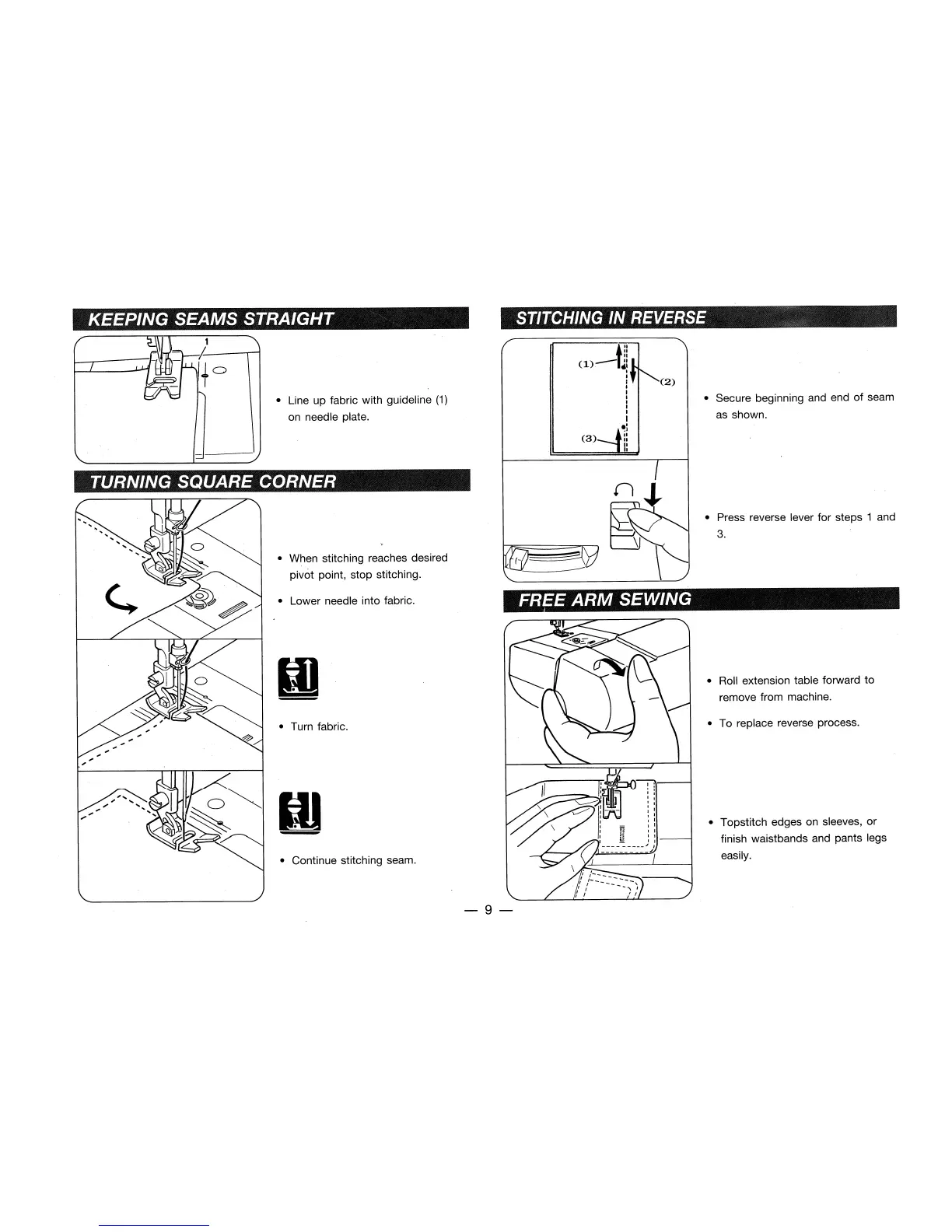 Singer 6412 - Keeping Seams Straight; Turning Square Corner; Stitching in Reverse; Free Arm Sewing