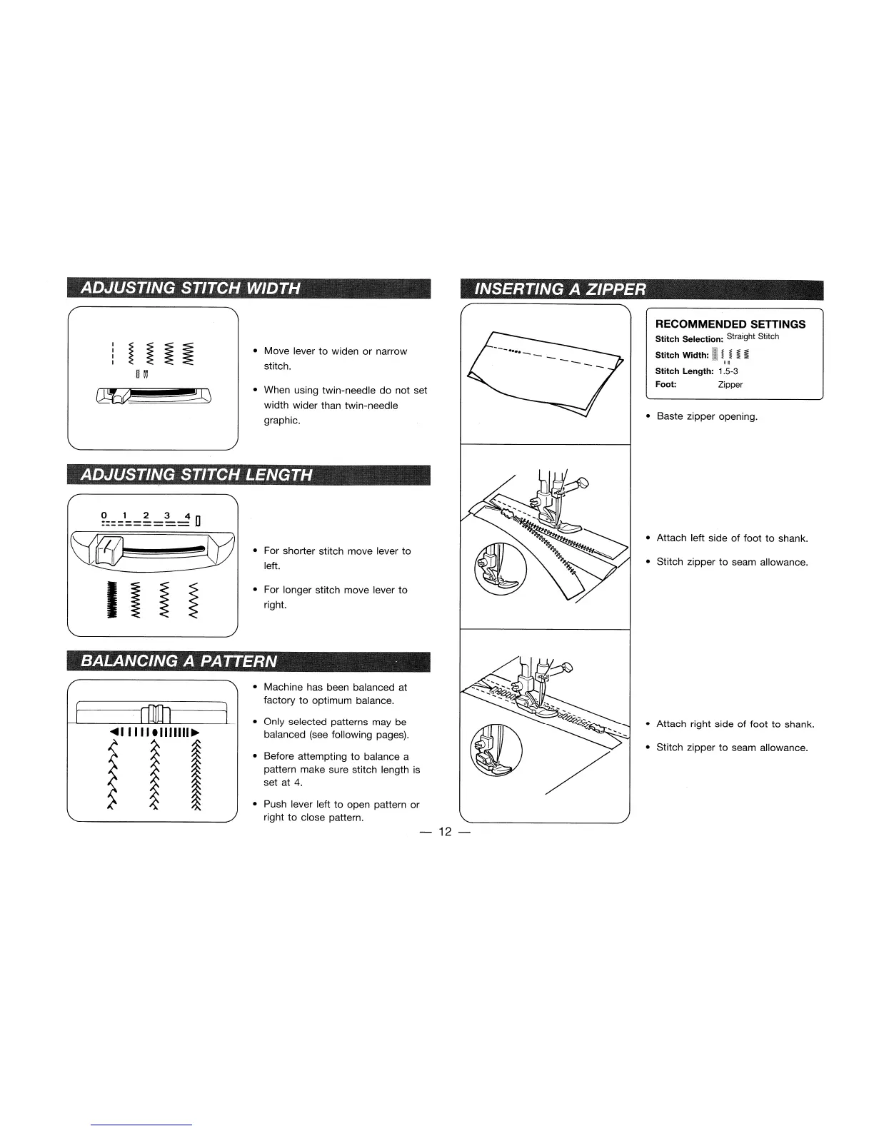 Singer 6412 - Adjusting Stitch Width; Adjusting Stitch Length; Balancing a Pattern; Inserting a Zipper