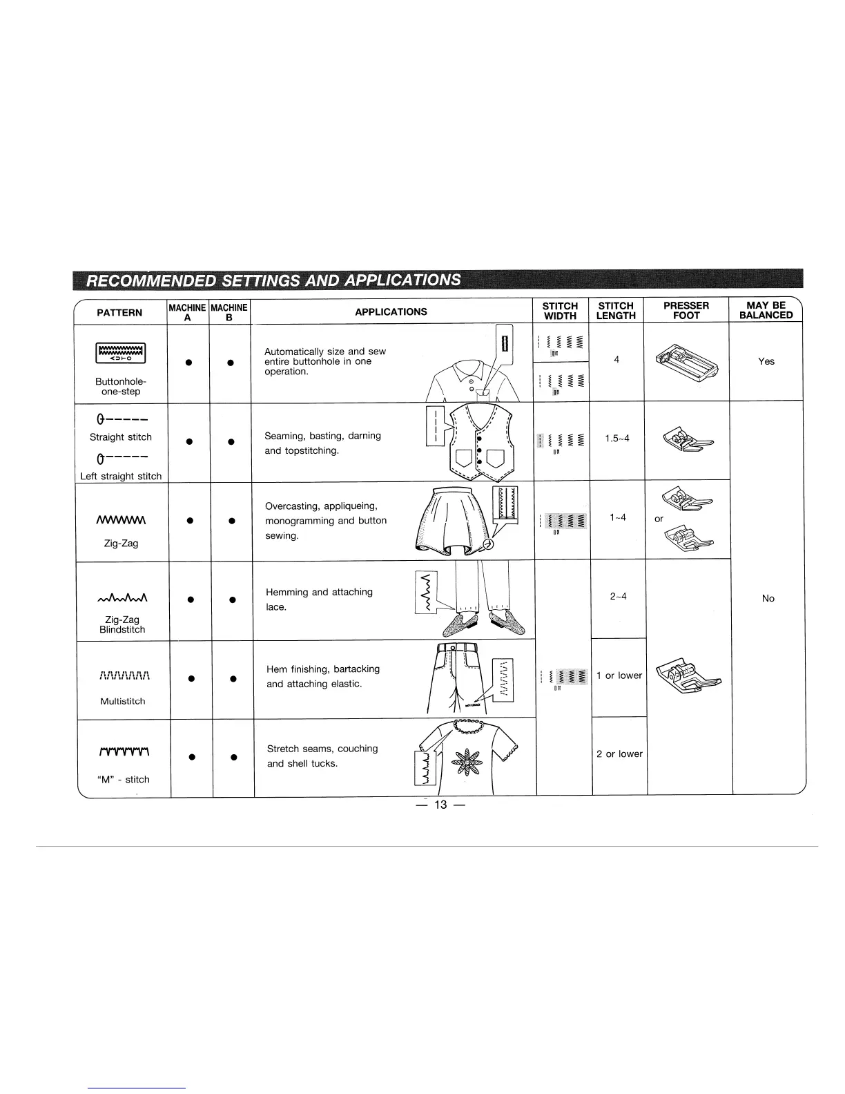 Singer 6412 - Recommended Settings and Applications; Buttonhole-one-step; Straight stitch; Left straight stitch