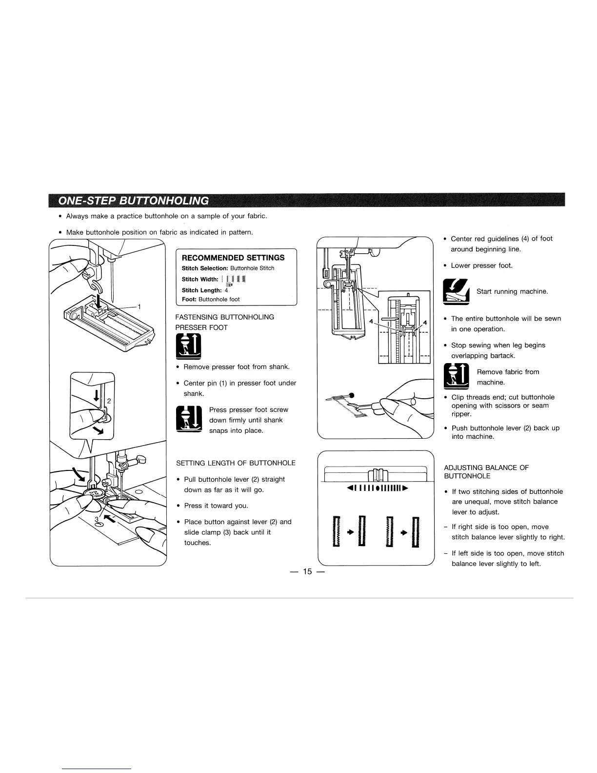Singer 6412 - One-Step Buttonholing; Fastening Buttonholing Presser Foot; Setting Length of Buttonhole; Adjusting Balance of Buttonhole
