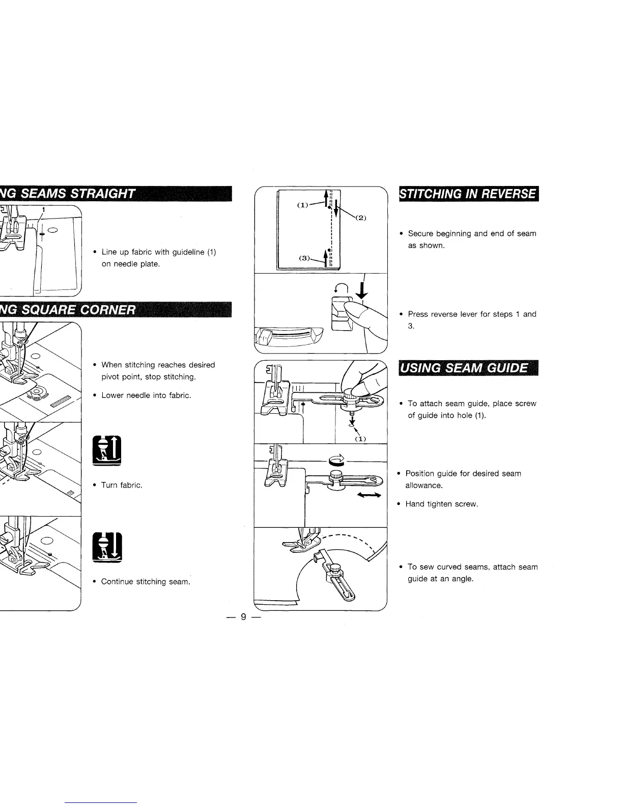Singer 6416 - Keeping Seams Straight; Turning Square Corner; Stitching in Reverse; Using Seam Guide