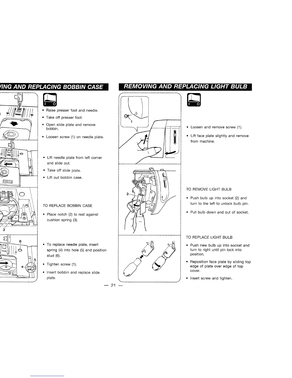 Singer 6416 - Removing and Replacing Bobbin Case; Removing and Replacing Light Bulb