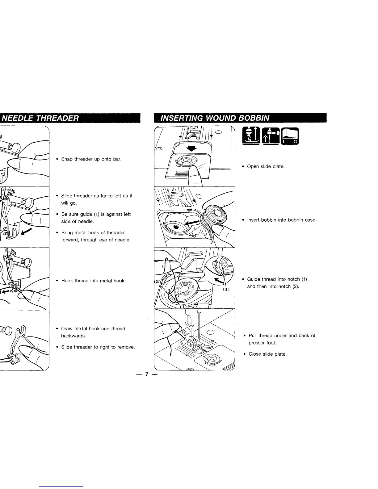 Singer 6423 - NEEDLE THREADER; Snap threader up onto bar.; Slide threader as far to left as it will go.; Be sure guide (1) is against left side of needle.