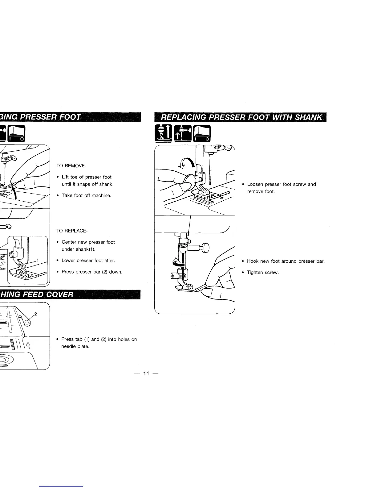 Singer 6423 - CHANGING PRESSER FOOT; TO REMOVE- Lift toe of presser foot until it snaps off shank.; Take foot off machine.; TO REPLACE- Center new presser foot under shank(1).