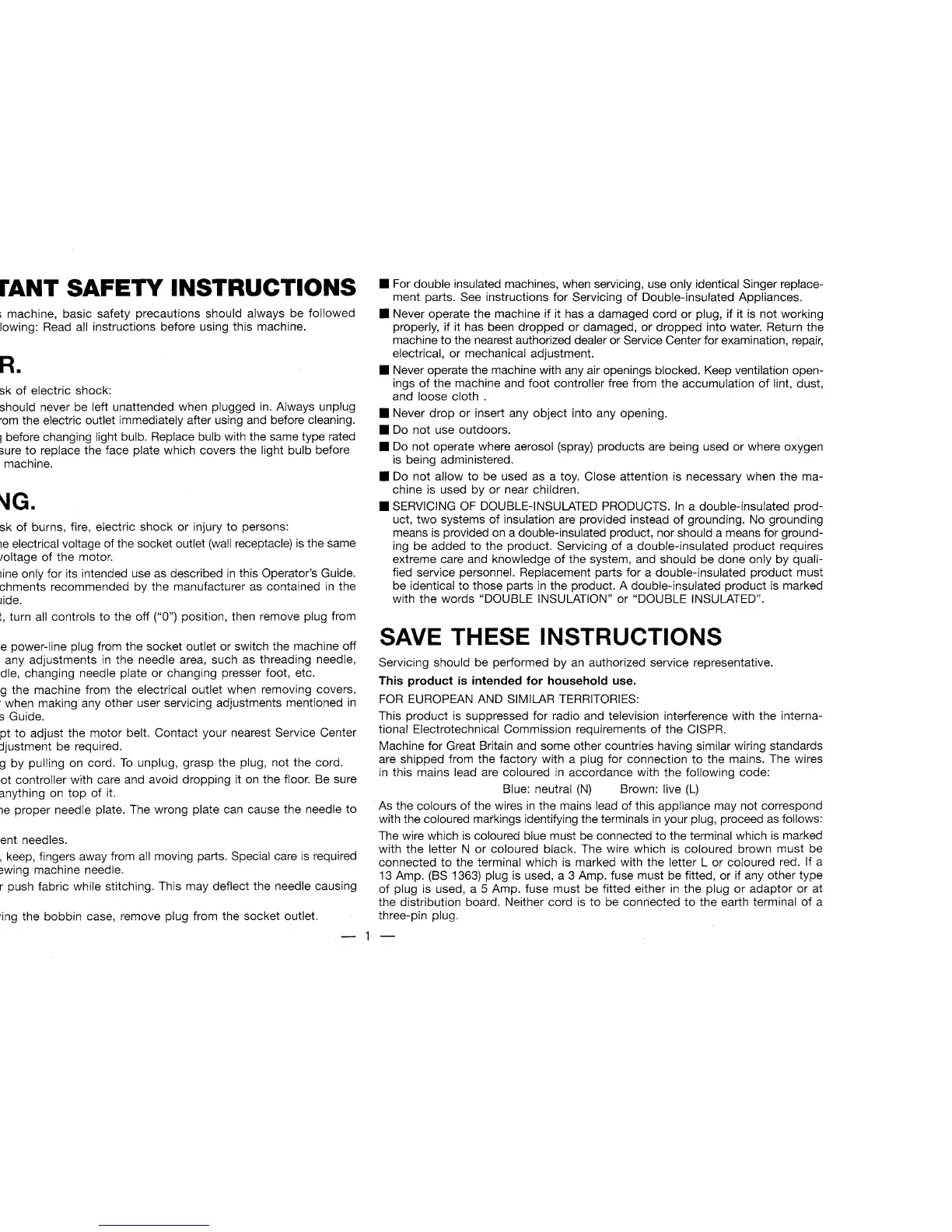 Singer 6423 - IMPORTANT SAFETY INSTRUCTIONS; For double insulated machines; Never operate the machine if it has a damaged cord or plug; Never operate the machine with any air openings blocked
