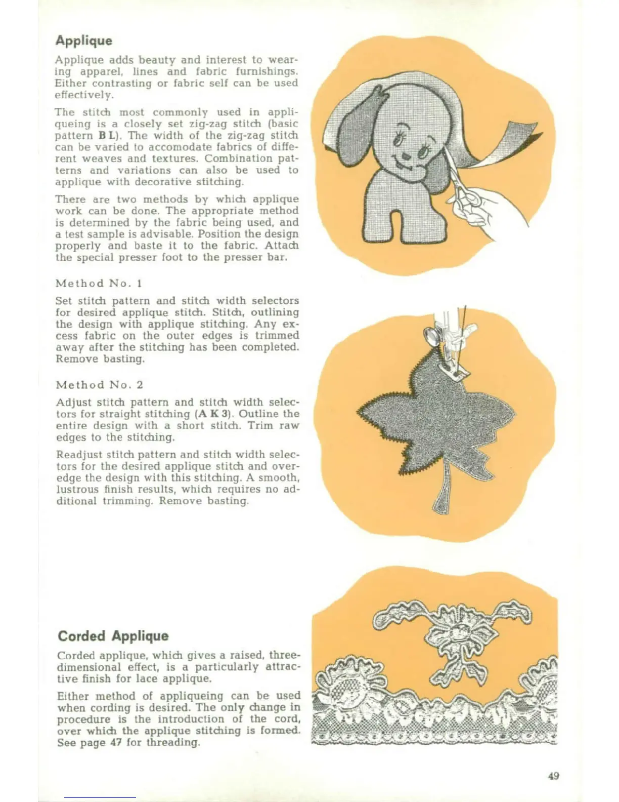 Singer 650 - Applique Techniques; Applique Method 1: Zig-Zag Outline; Applique Method 2: Straight Stitch Outline and Overedge; Corded Applique