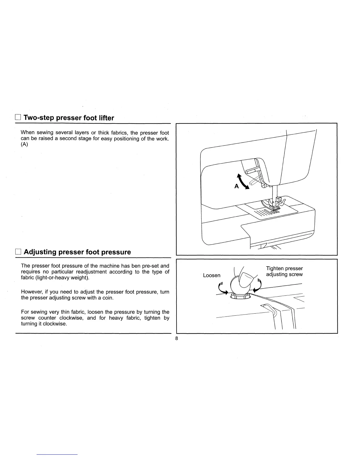 Singer 6510 - Presser Foot Adjustments; Two-Step Presser Foot Lifter; Adjusting Presser Foot Pressure