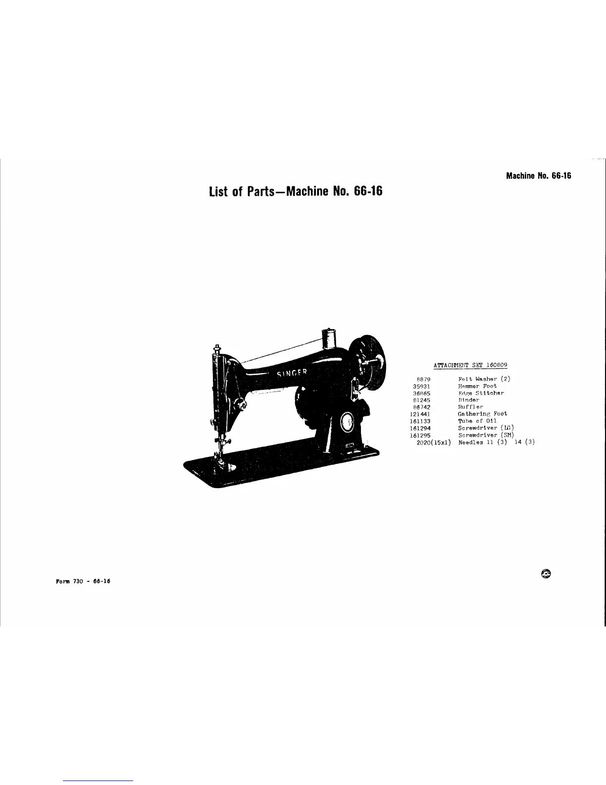 Singer 66-16 - Machine Parts and Attachments Overview; Attachment Set 160809