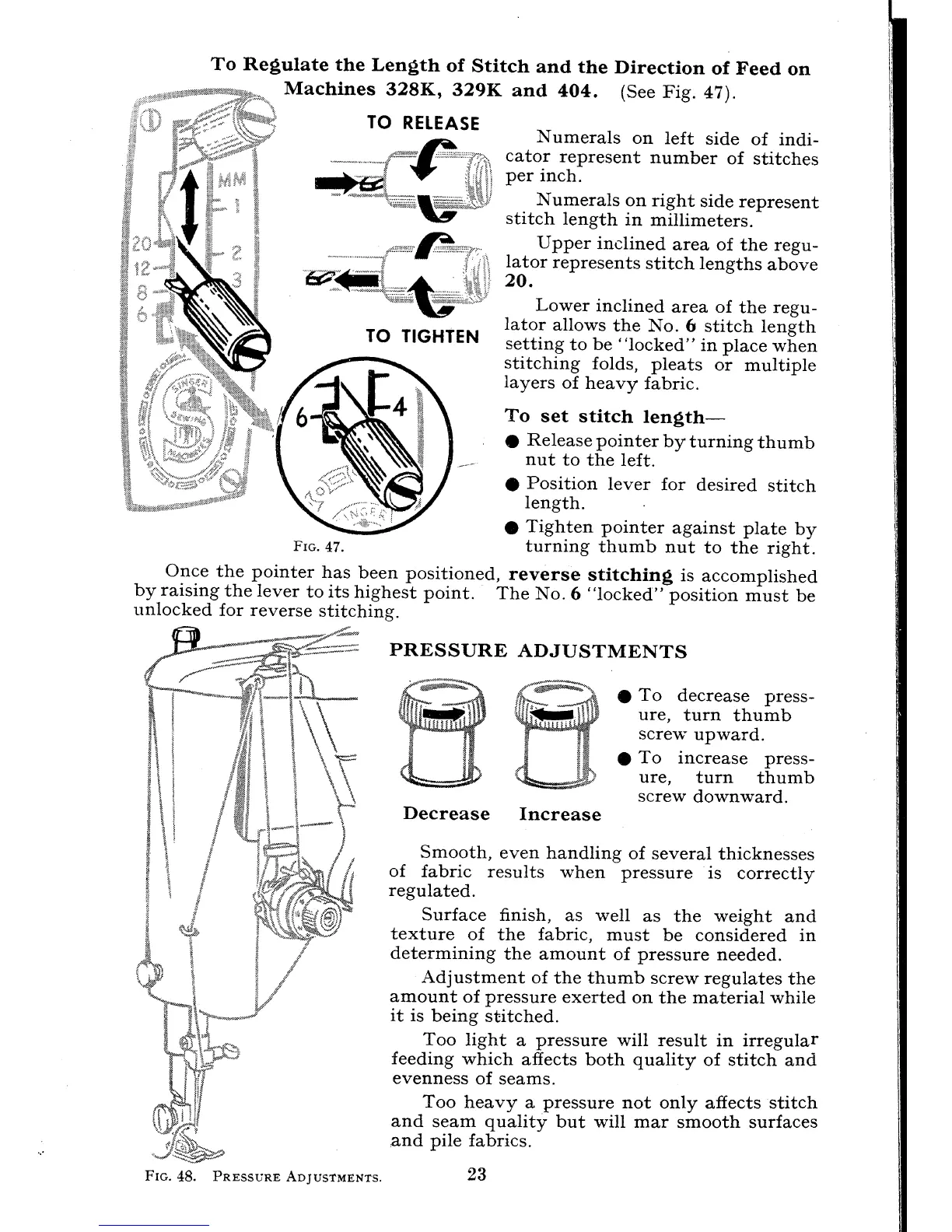Singer 66k - Adjusting Stitch and Feed for Other Models; Stitch and Feed for Machines 328 K, 329 K, 404; Pressure Adjustments