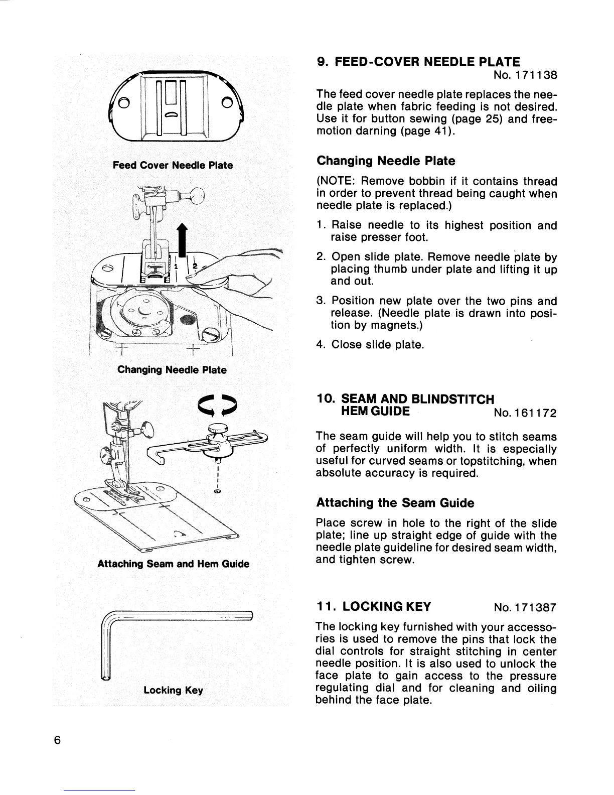 Singer 6704 - Feed-Cover Needle Plate; Seam and Blindstitch Hem Guide; Locking Key; Changing Needle Plate