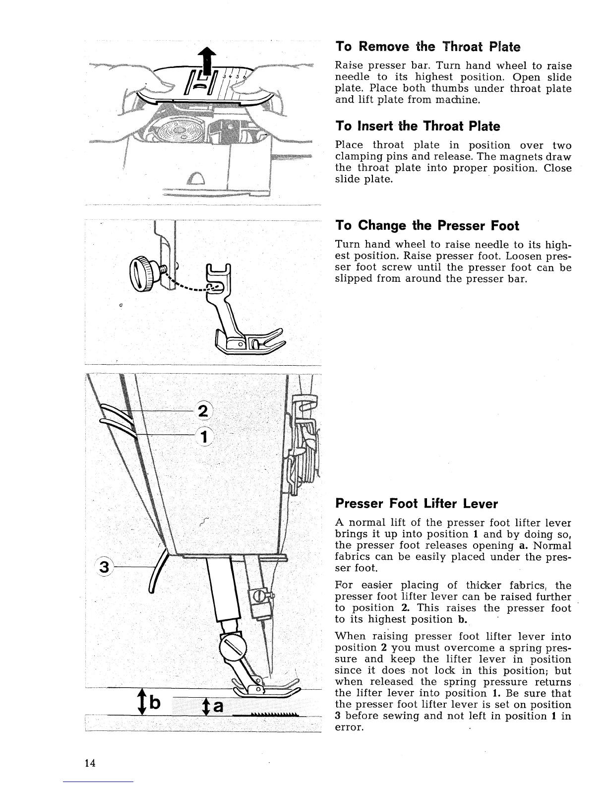 Singer 677 - To Remove the Throat Plate; To Insert the Throat Plate; To Change the Presser Foot; Presser Foot Lifter Lever
