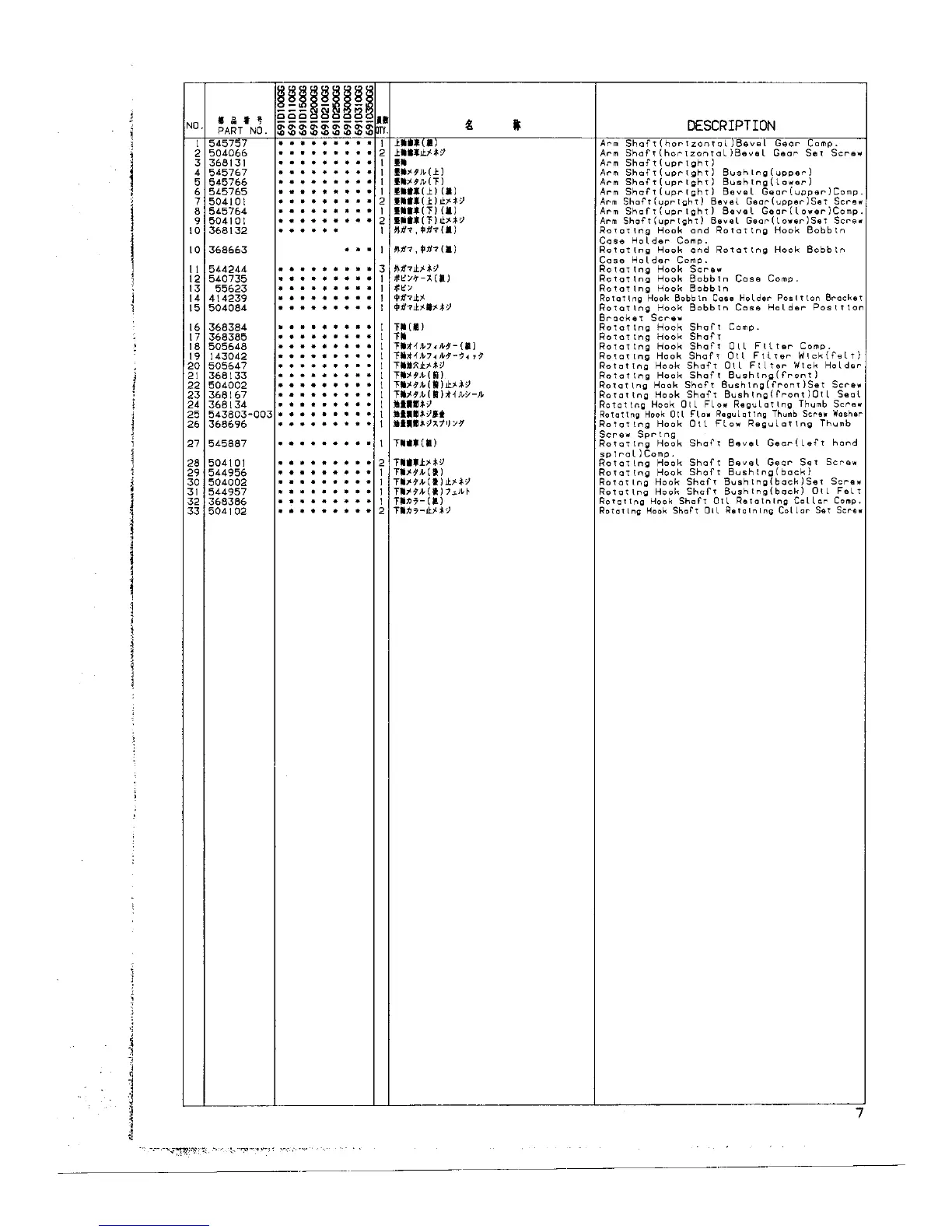 Singer 691 - Arm Shaft Bevel Gear Components; Rotating Hook Bobbin Case Holder; Rotating Hook Shaft and Bushings